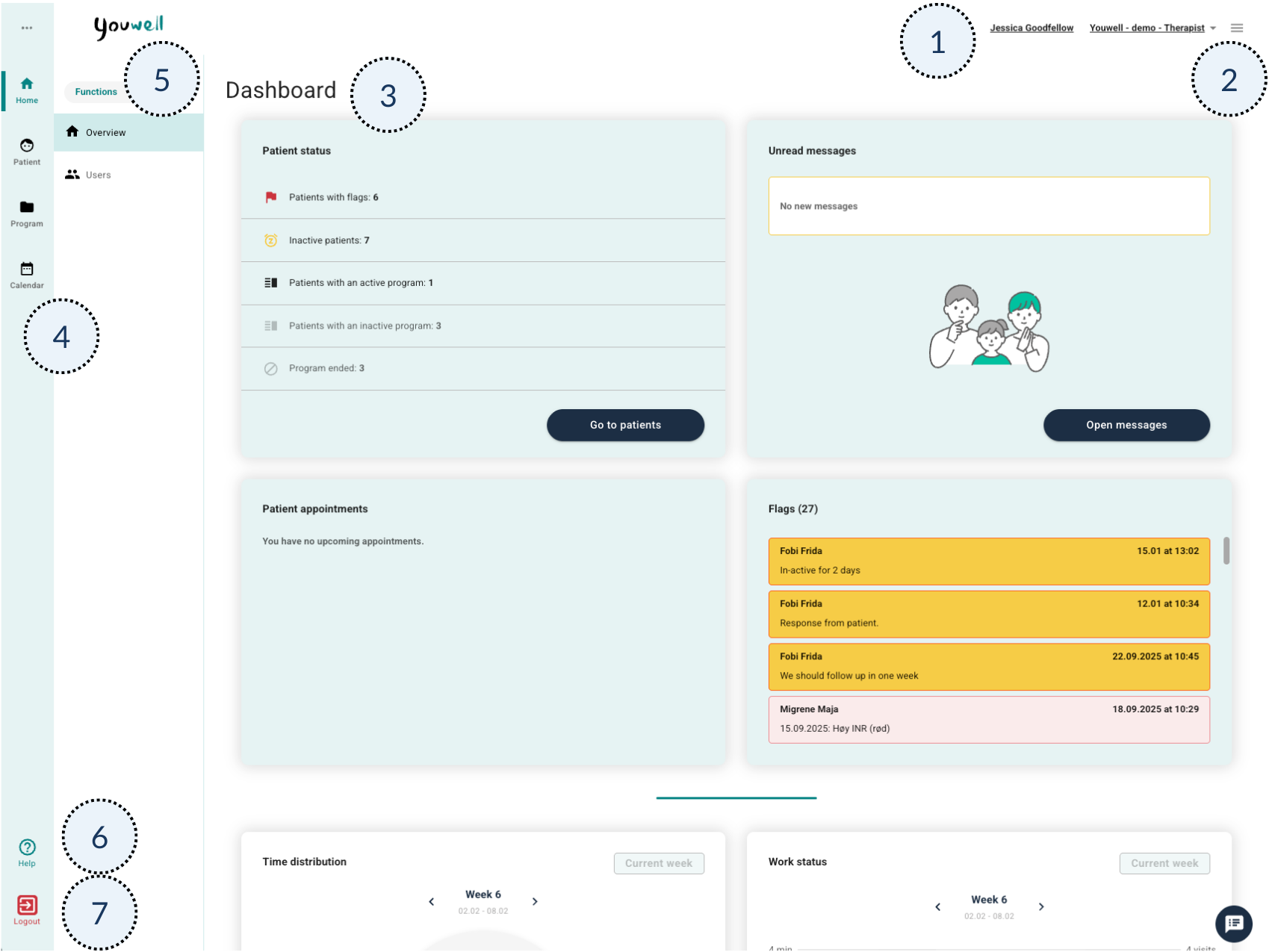 This overview shows areas that users with the clinician role (also referred to as therapists) typically see in the system: