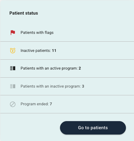 Patients with flags are patients where an event or a flag has been registered. Inactive patients have not been active in the last 7 days. Patients with an active program have been assigned a programme and are in an active programme period. Patients with an inactive program have read-only access to the programme, and do not have the possibility to answer questions in modules or send messages. Patients with Program ended no longer have access to the programme.