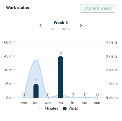 The chart shows the total number of hours and number of visits in the last week. It is possible to use the arrows to scroll back and forth to see different time periods. There is also a Current week button at the top to return to the current week.