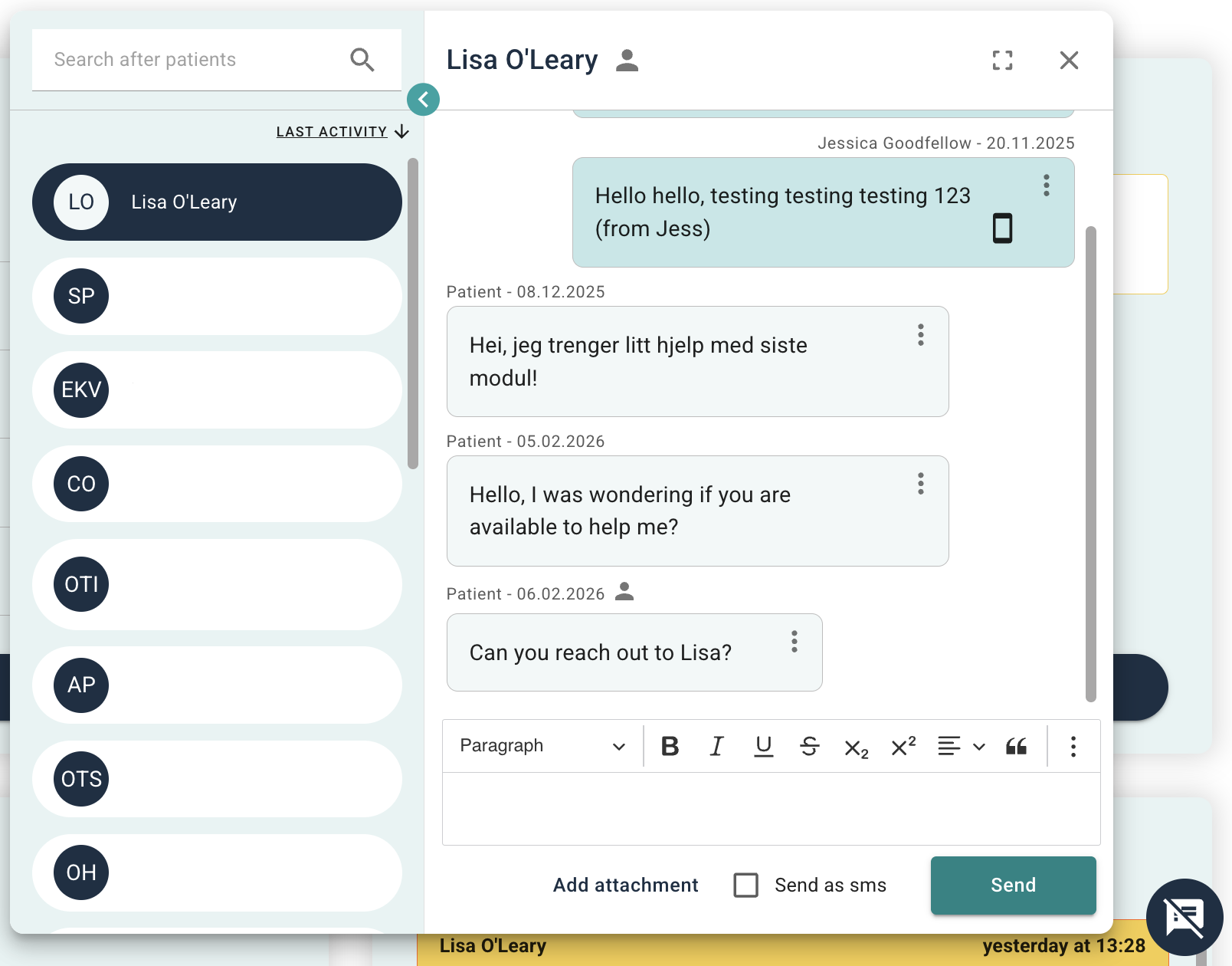 The patient has a slightly simpler view where they can enter plain text and send attachments. The patient sees the time when messages were sent, and from which clinician. If a relation has written a message, an icon of a person will be shown next to the message.