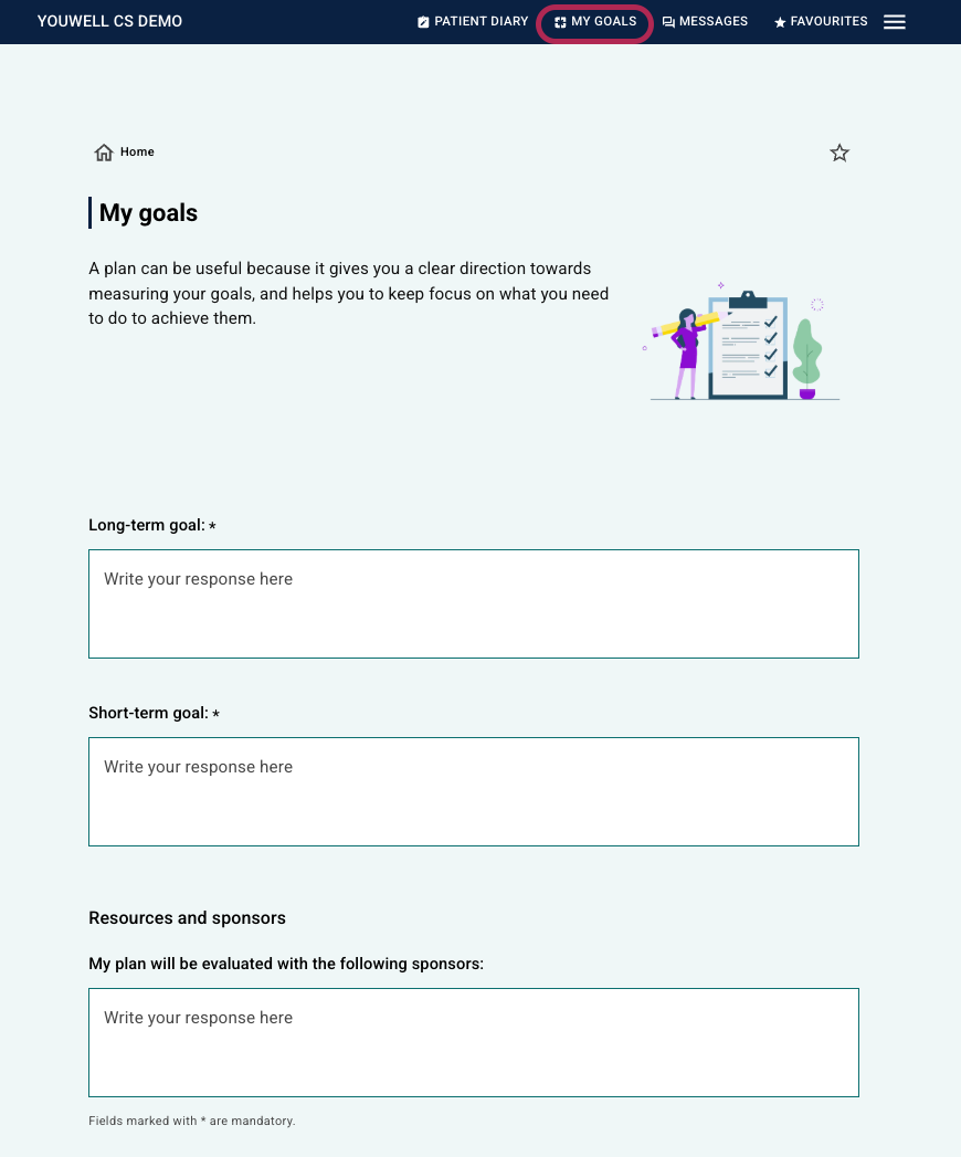 - “My goals” page where the patient can enter their short-term and long-term goals for the programme.