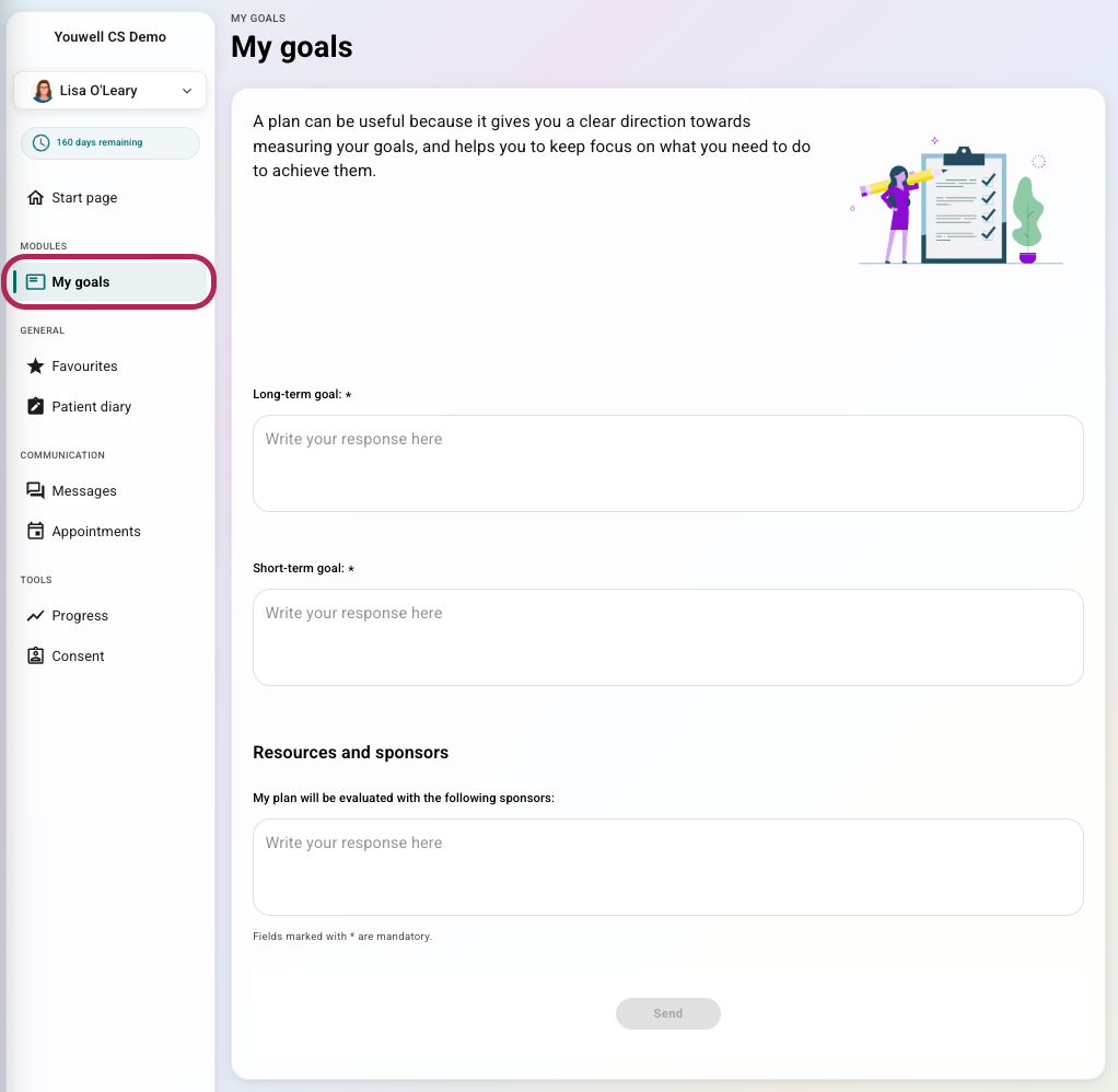 In addition, Additional content is shown in a different area for the patient when they are logged into the patient application. Here is an example of a page with several free-text questions, with the name “My goals”, which is available in the menu for the patient: