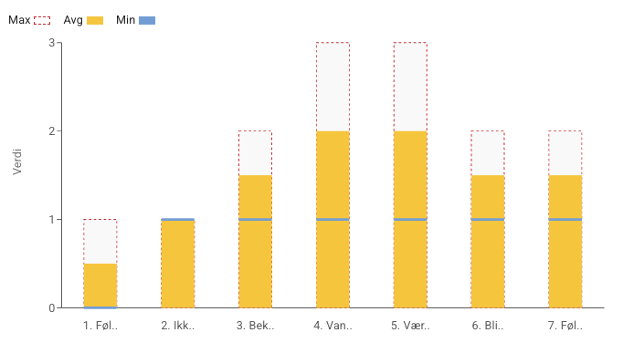 The different statements/situations are listed on the X-axis, and the values that the patients have entered are measured on the Y-axis. It is also indicated what is recorded as minimum and maximum, as well as average. By moving the mouse pointer over the different columns in the chart a small popup with the values for the current question is shown.