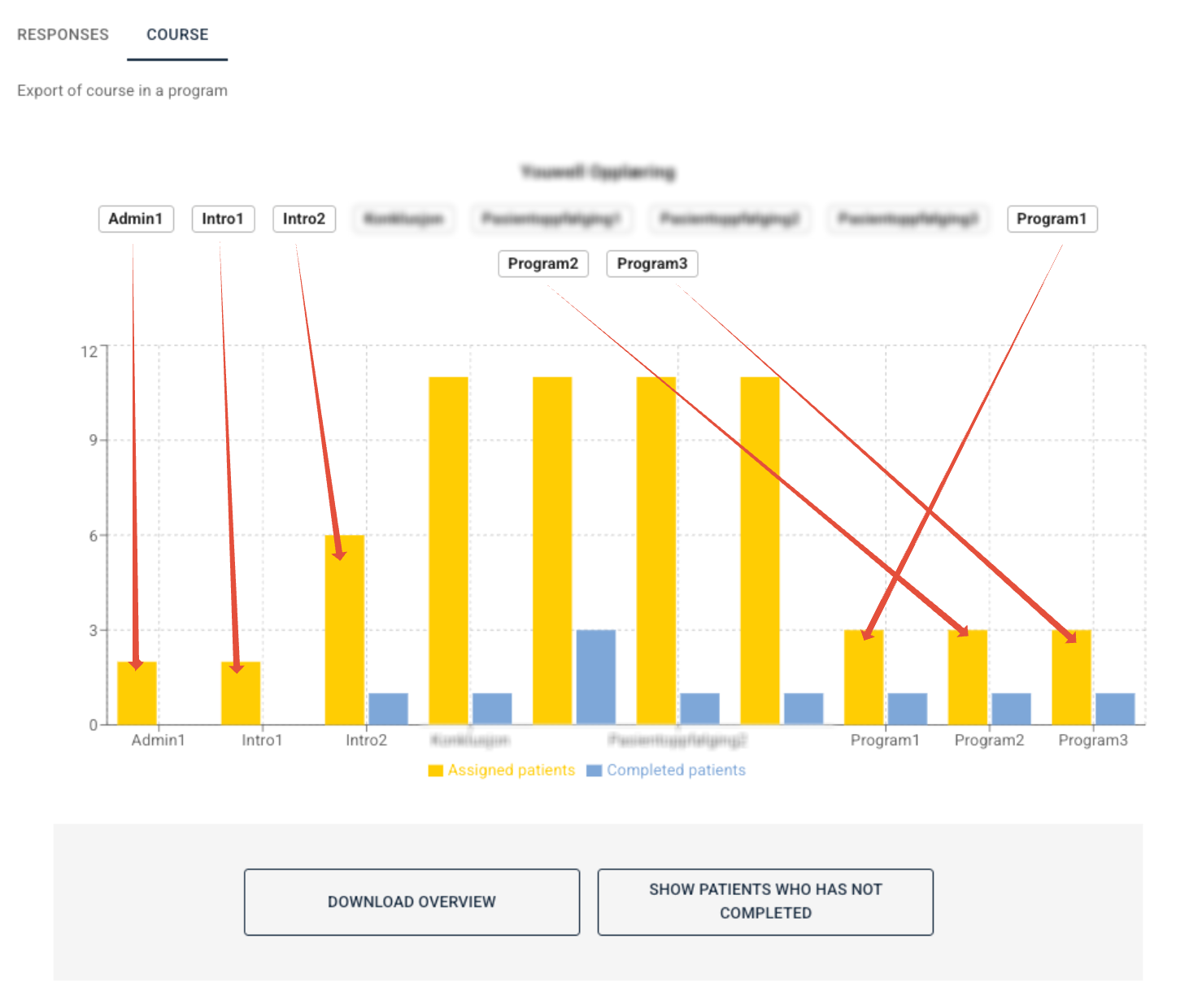 Under Course it is possible to see grouping of responses on one or more questionnaires. This is used to illustrate how many forms or content pages have been sent to the patients and how many have answered them.