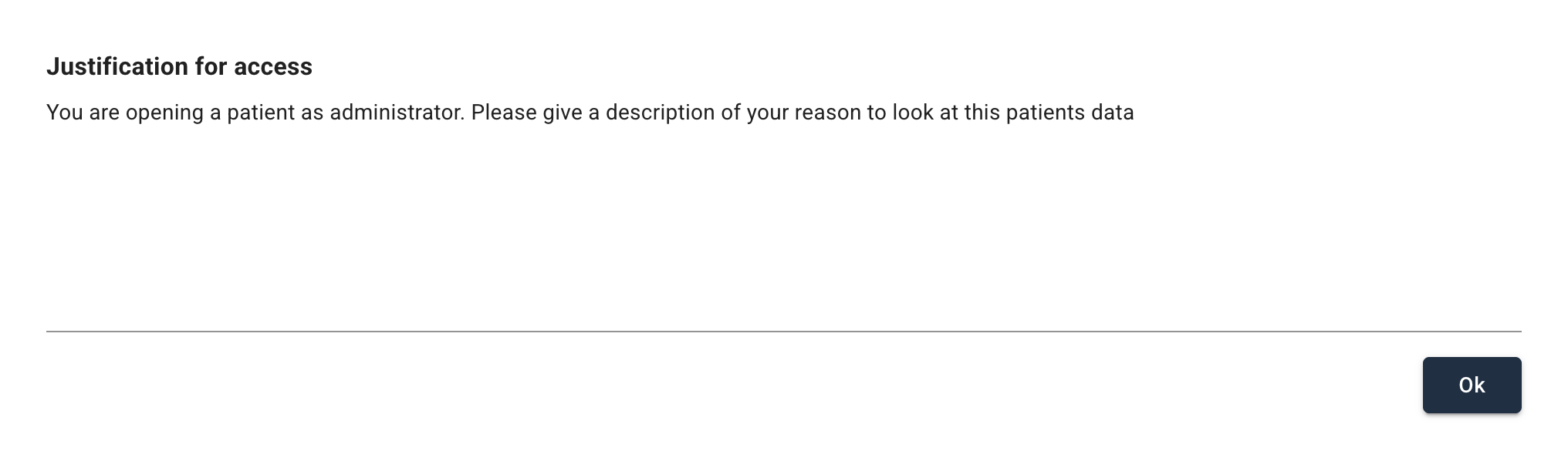 It is also possible to specify whether patients can give anonymous feedback, whether notes can be deleted, and whether the administrator must give a justification for accessing patient data. If Require that the administrator must give reason for viewing patient data is activated, a pop-up similar to the example is shown when the administrator opens a patient.