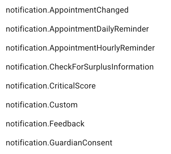 Under Notification types for therapists it is possible to choose between Flagged response (critical score) and/or Message. This determines which situations or events lead to clinicians receiving notifications from the system.