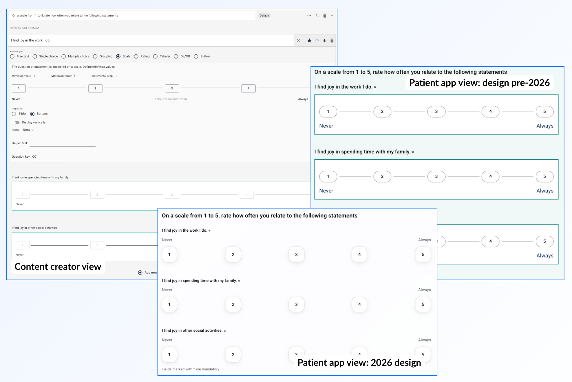 First, it can be useful to consider how the patient can answer the questions in the questionnaire as this will influence the format you choose. For example, they can choose a number between 1 and 10, use free text, or a combination of text, scoring and scale depending on what is relevant for the questionnaire.
