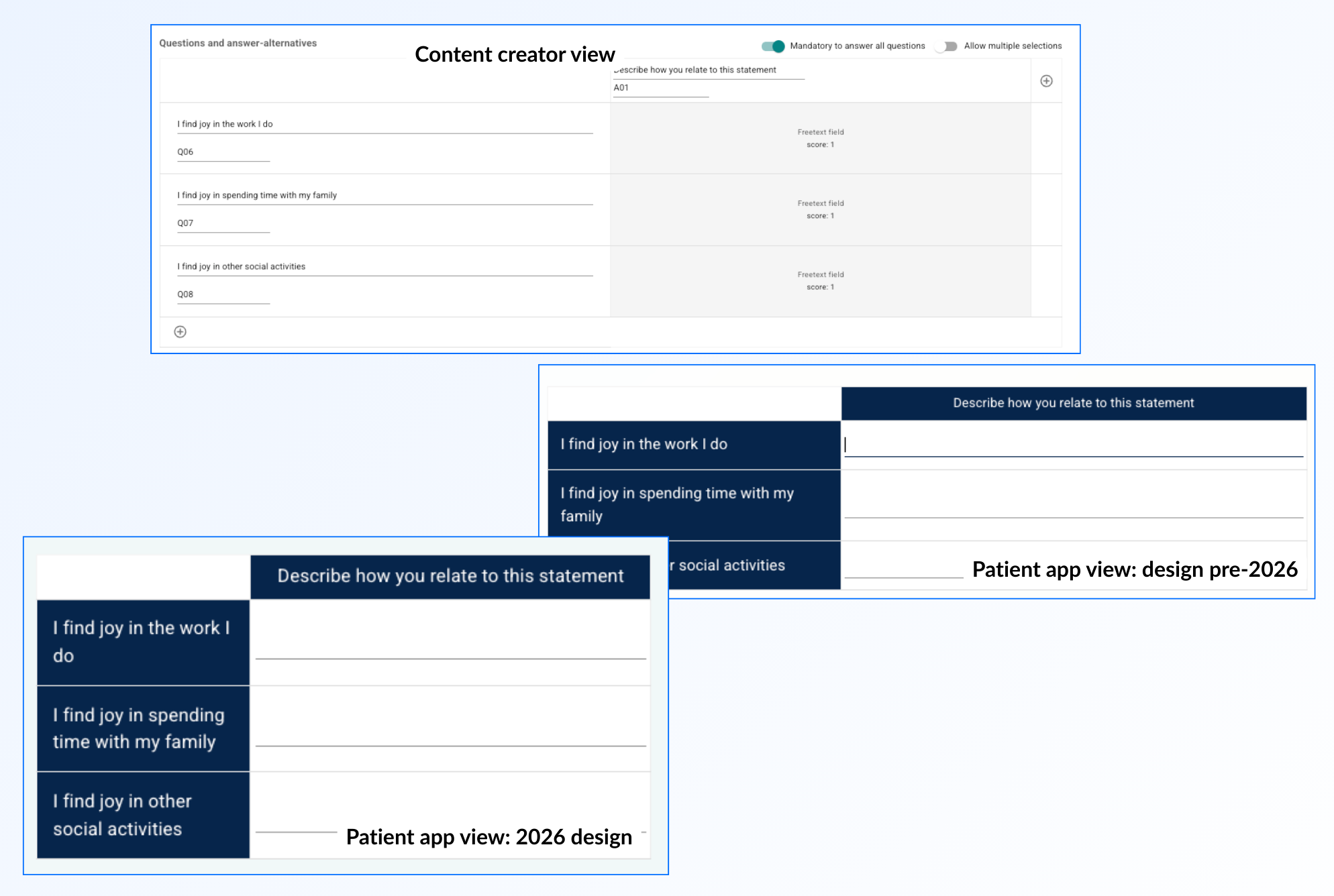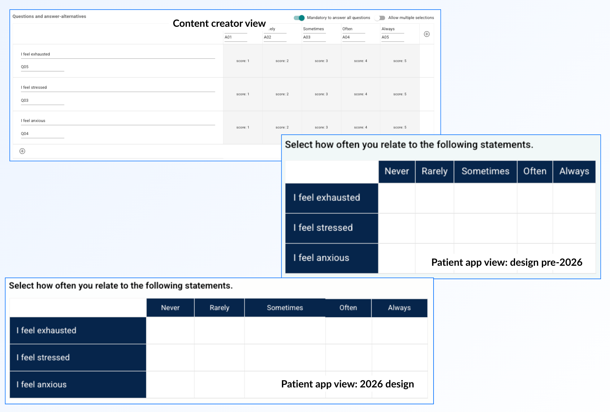 If it is relevant to allow the patient to give different scores to a series of statements, a questionnaire element can also be used for this. The questions or statements can be listed in the rows, and then the number of columns can be adjusted so that they represent a scale or degree of rating for each item. This gives a structured layout where the patient can indicate how often various symptoms are experienced or similar assessments.