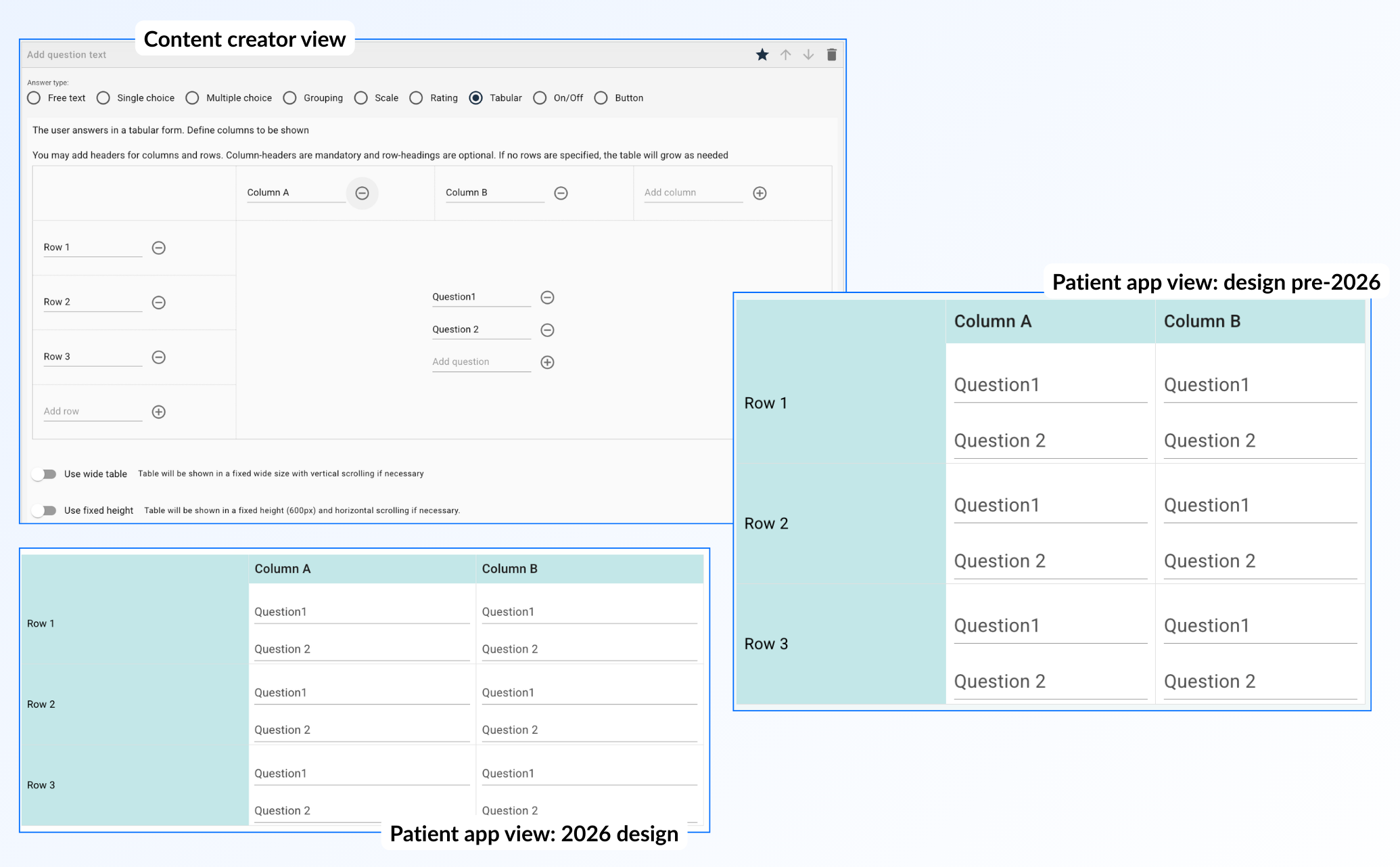 Another option is a table, which is a standard way to list various questions. In this case a default element can contain the table with question text in the rows and columns that indicate where the patient can give their response. This provides a clear structure for simple questions and answers for the patient.