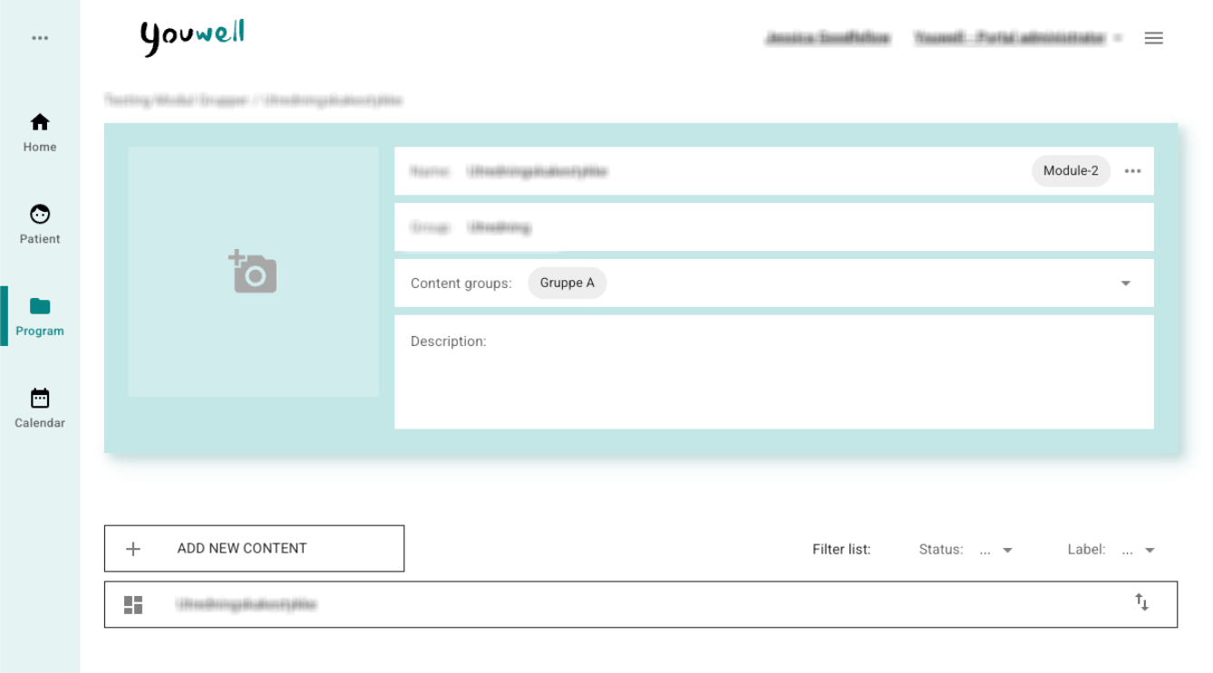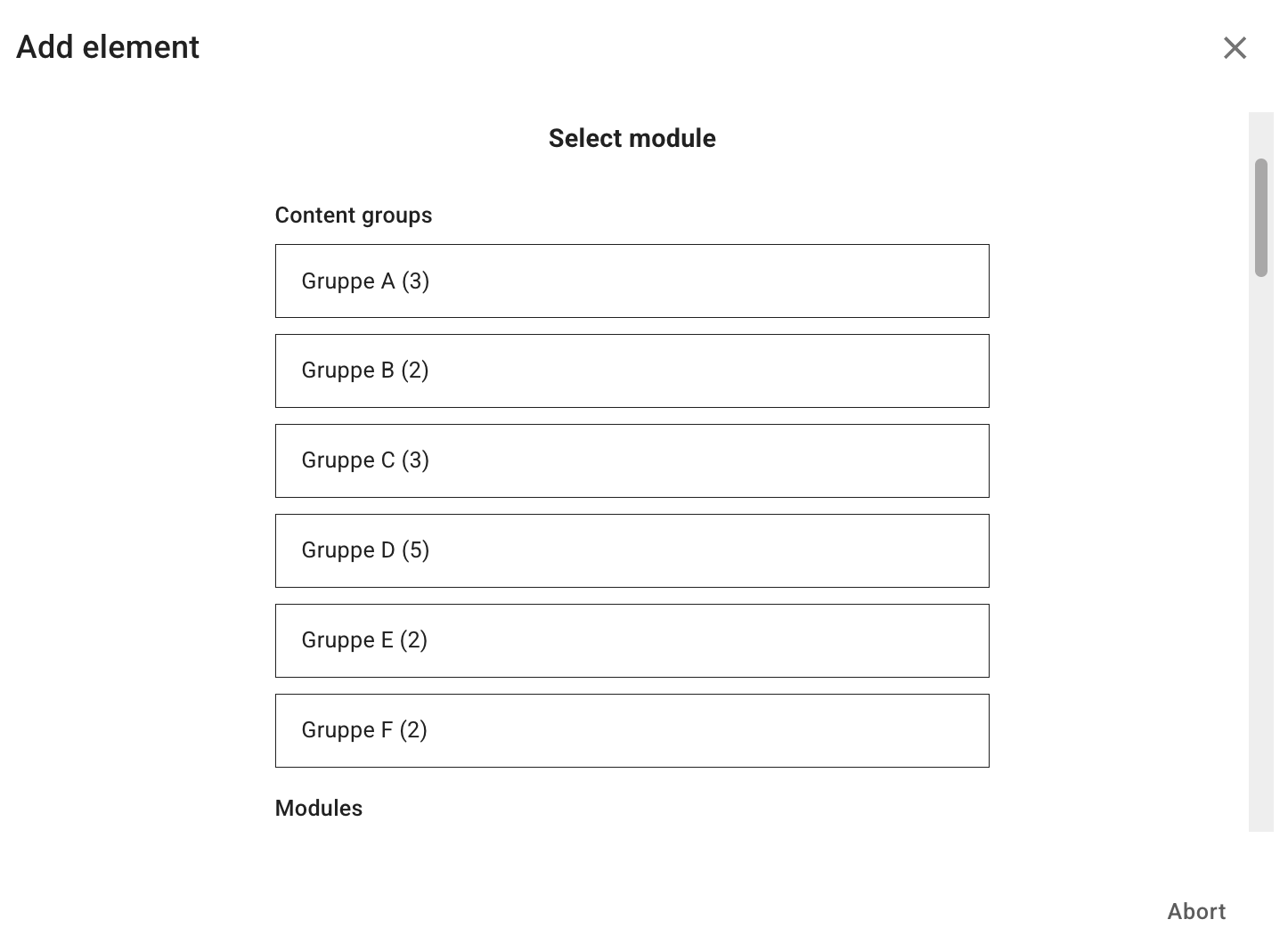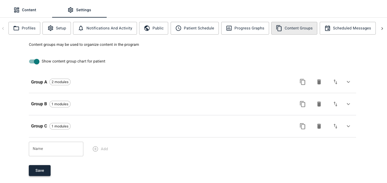 You can create a new content group by including a Name and selecting Add, and then you may add modules to the group. A group should optimally have one or more modules included, and you can alway reorder the modules and remove modules afterwards.