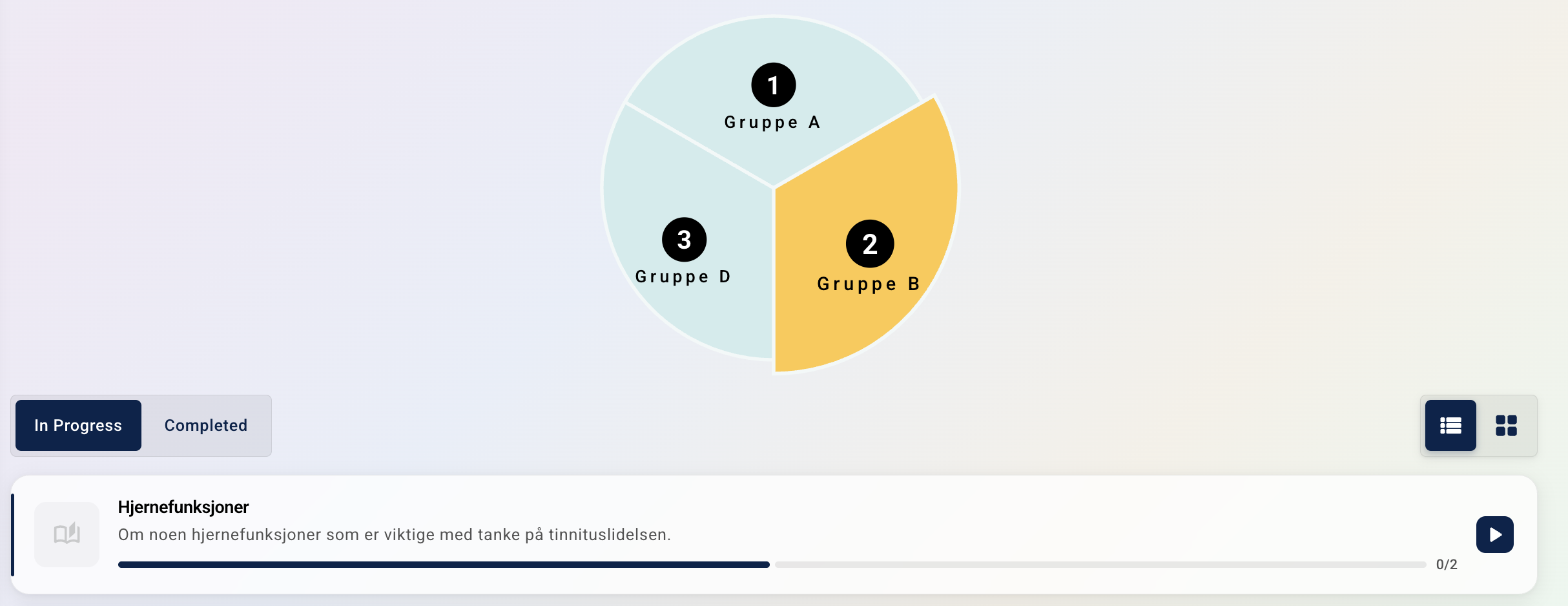 An additional option when using content groups is to activate a pie chart display which will be visible for patients and therapists. When the Show content group chart for patient toggle is activated, the module groups will be visualised as segments within a pie chart which are clickable: