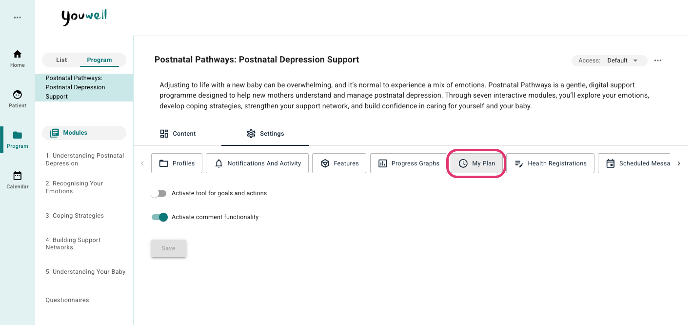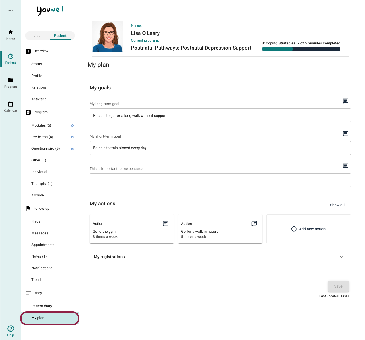 My Plan is a functionality that can be activated in a program. It gives the patient the possibility to set their own goals and record actions that support said goals. When the functionality is active, it is shown as an option in the menu in the patient application. Contact support if you are interested in testing this functionality.