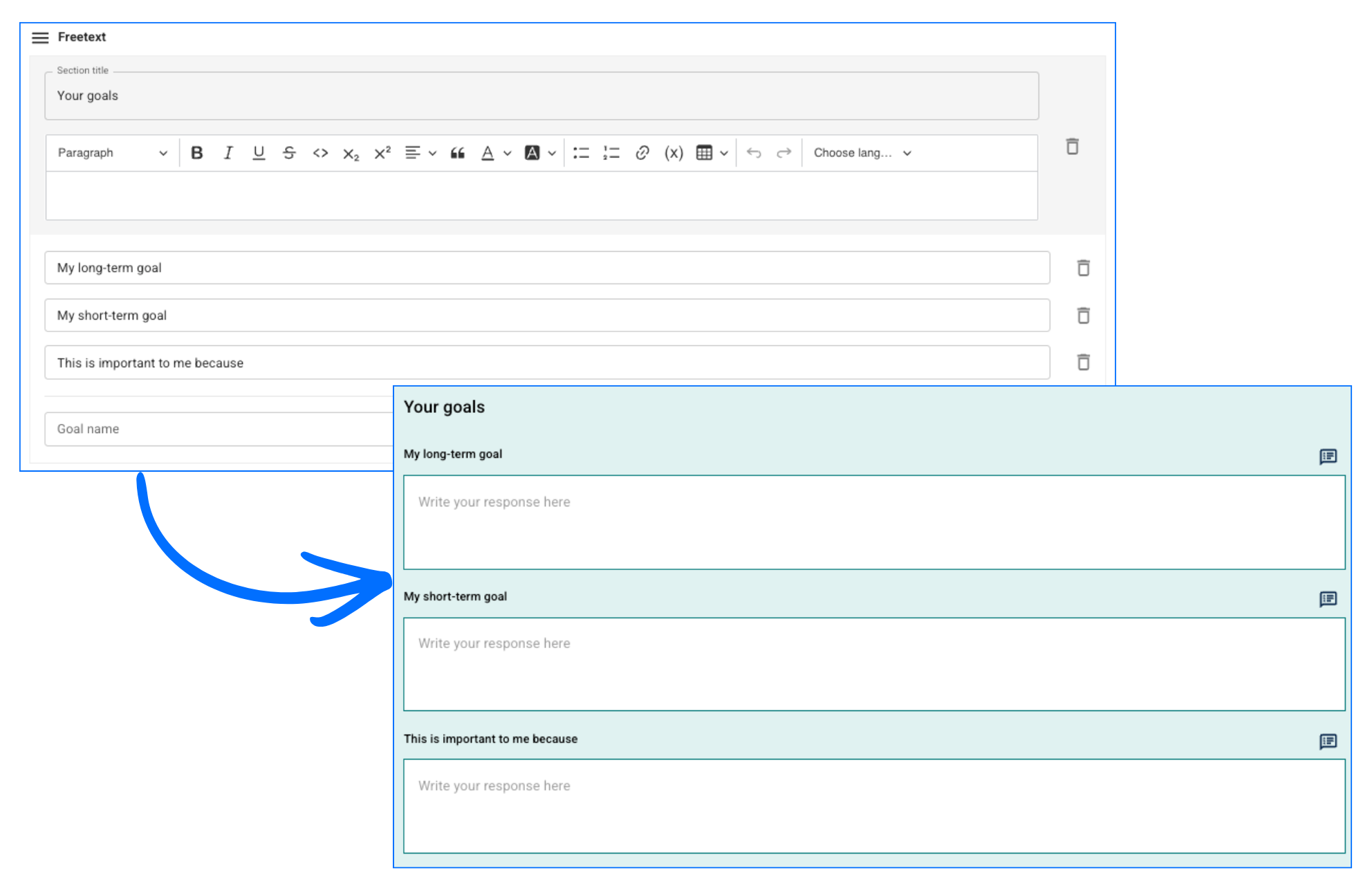 When tools for goal setting and actions are active, a Description can be entered which is shown at the top of the page. Here you can use the same rich text formatting as on content pages (with support for text, images, headings etc.).
