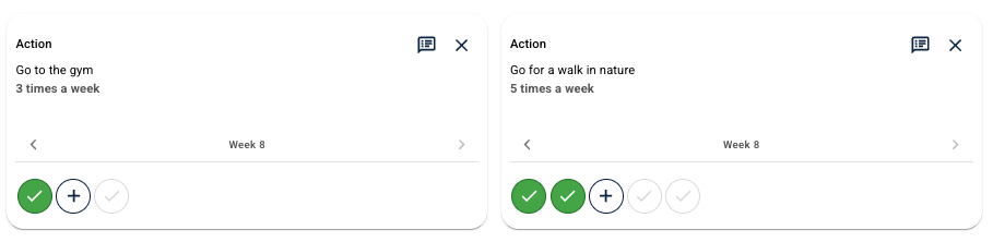 The actions can be recurring so that the patient can choose how often the action should be carried out (1–7 times per week). When an action is marked as completed during the week, a confetti animation is shown as visual encouragement.
