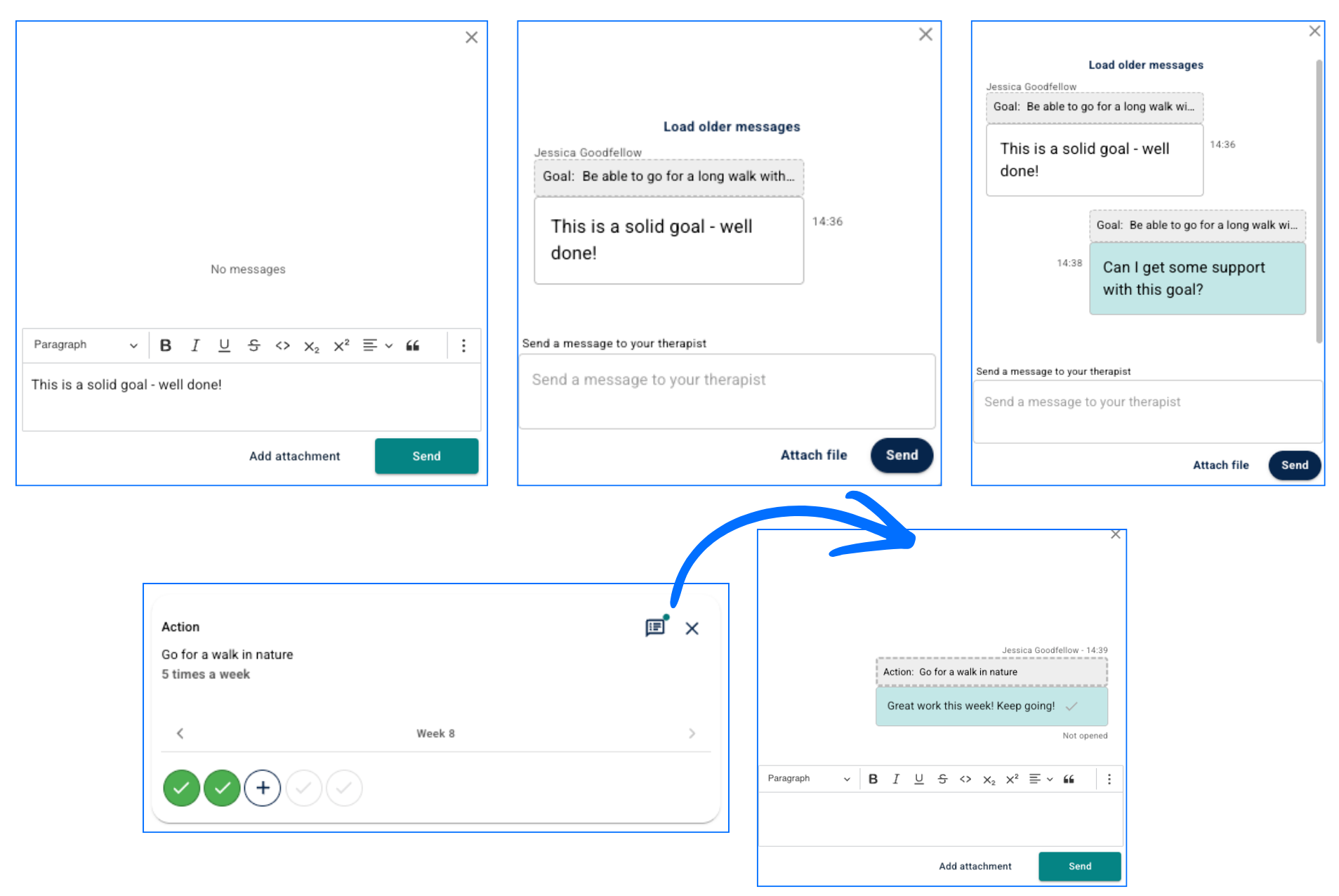 In addition, messages and comments on individual goals and actions can be activated so that clinician and patient may communicate directly about the goal setting.