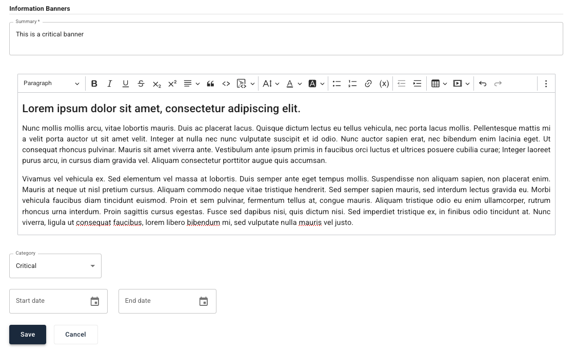 The start and end dates control when a banner is active. Only active banners are displayed to patients.