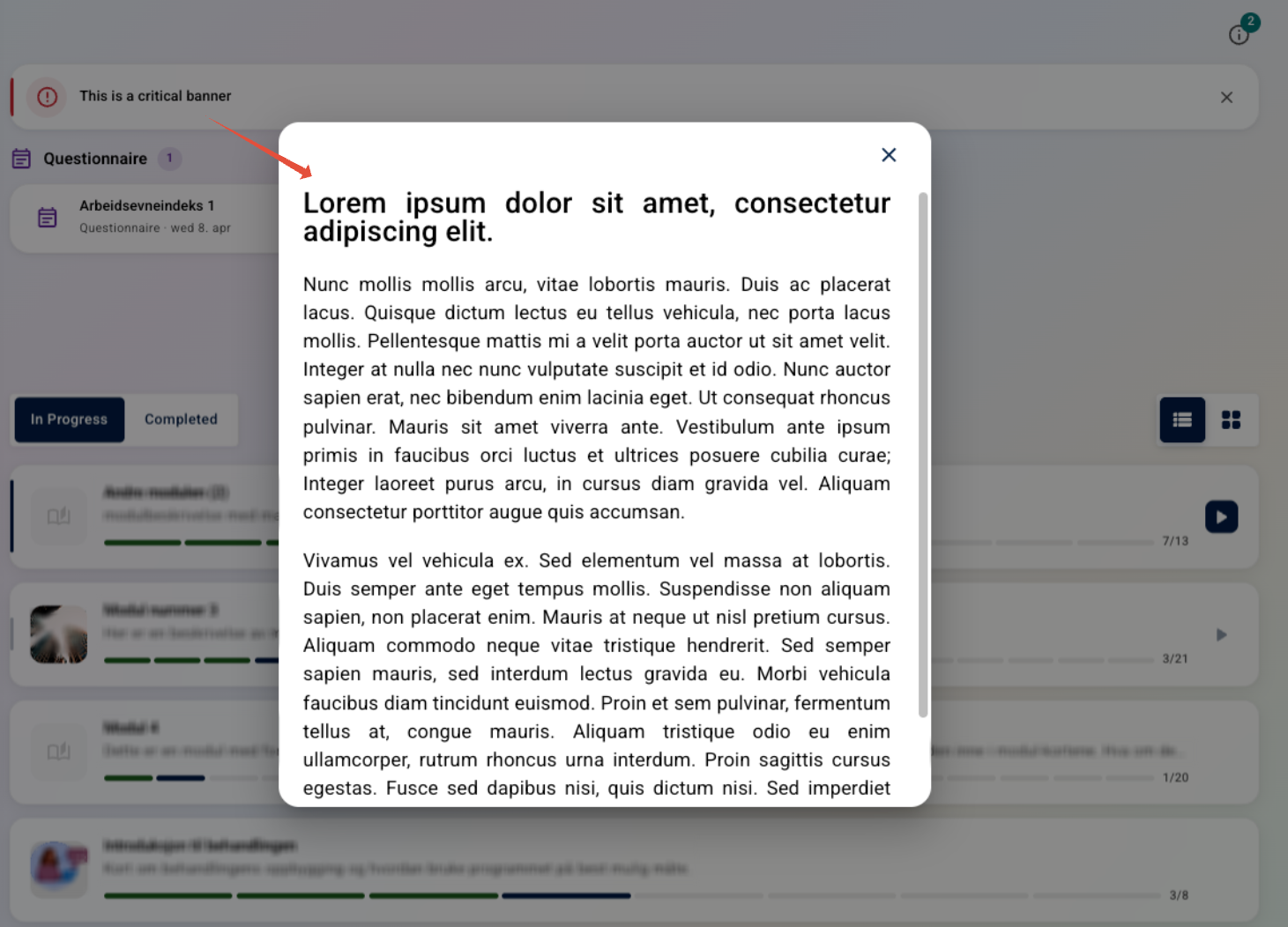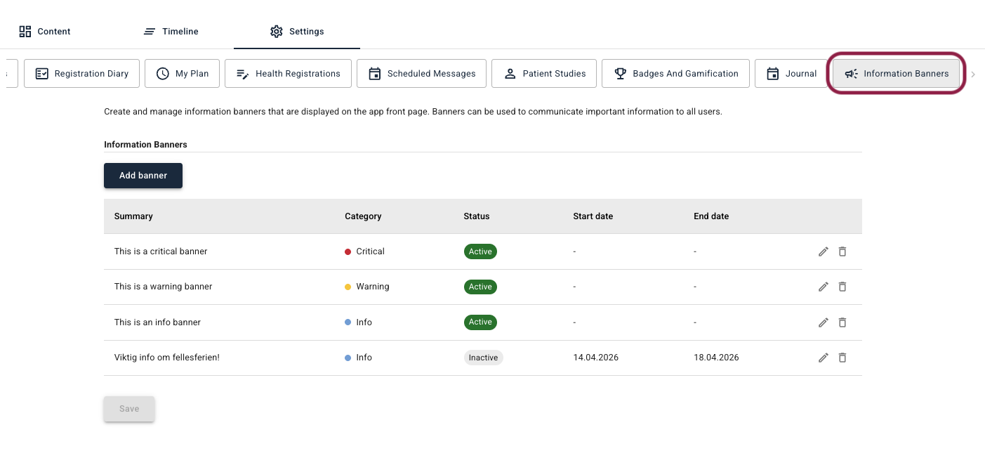 Each banner consists of a short summary text and the full message content. This makes it possible to share important information with patients, such as upcoming changes to programme content, holidays or absences that may affect follow-up with their therapist, or other relevant resources during certain time periods. An example may be during periods of heightened public health concern when you may want to share specific guidance or articles.