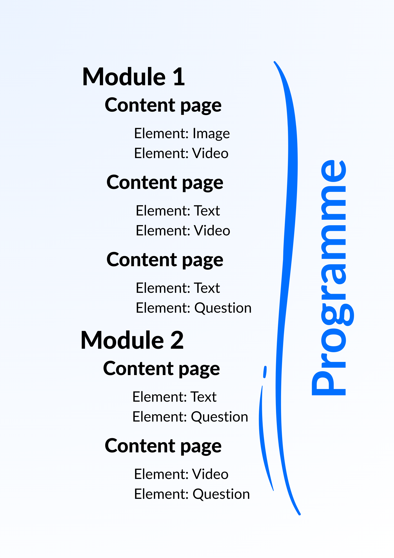 Et program inneholder ofte en kombinasjon av moduler, spørreskjemaer og annet innhold, typisk med rundt 5–8 moduler, noen spørreskjemaer og 1–2 sider med annet innhold.