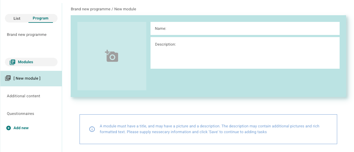 Ved oppretting av en ny modul kan et bilde, en tittel og en beskrivelse legges inn.