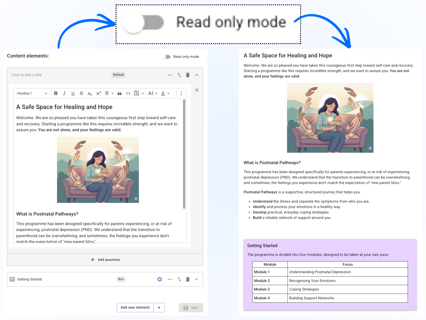 For å se hvordan formateringen på hvert element kan se ut, kan Visningsmodus brukes. Det er også mulig å bruke øye-symbolet ved tittelen på innholdssiden for å vise en forhåndsvisning av alt innhold på siden: