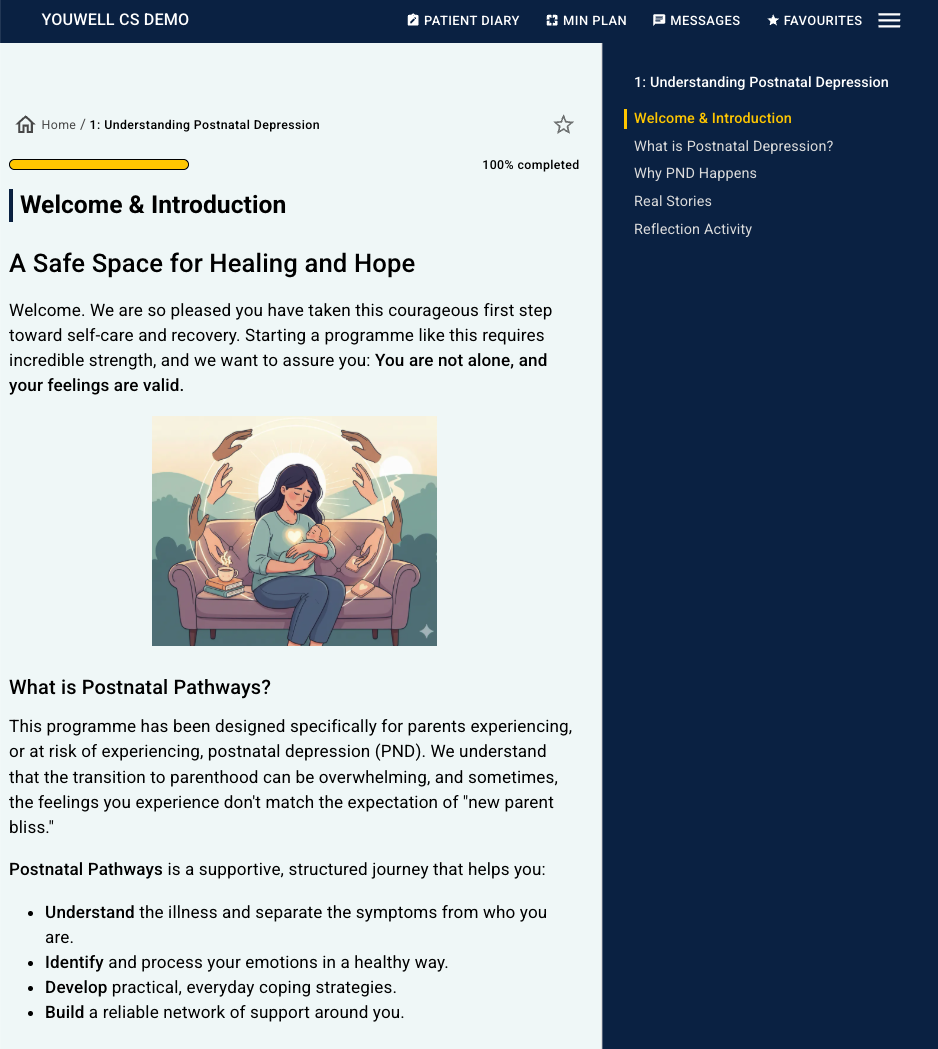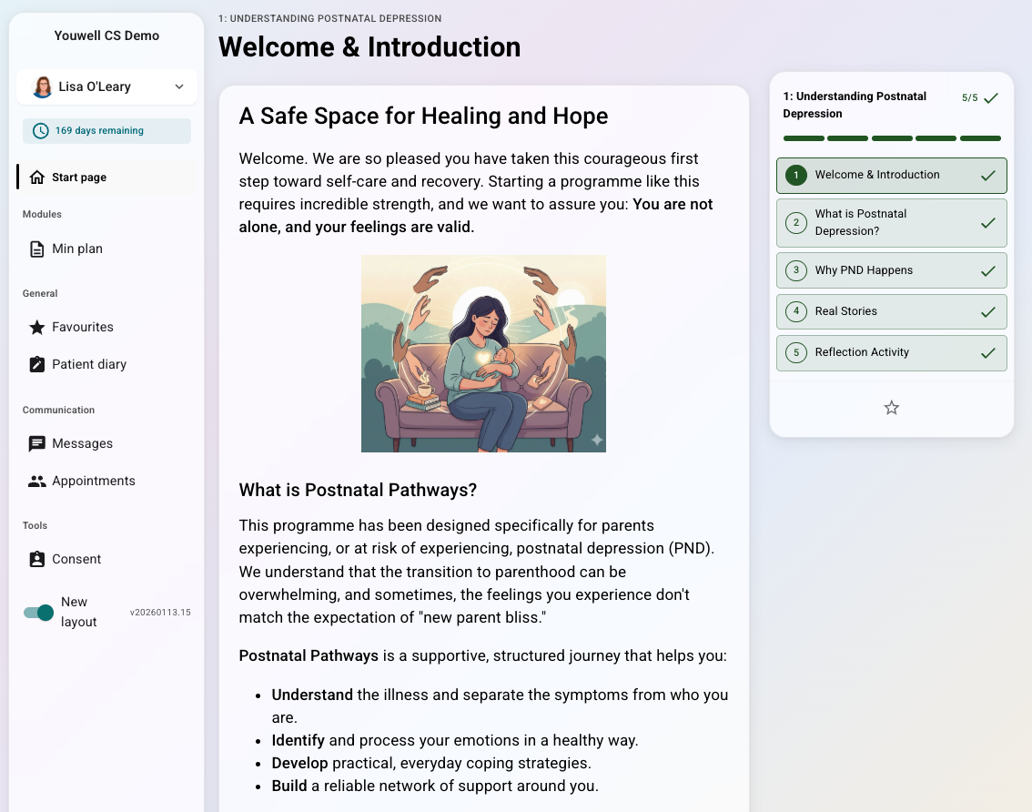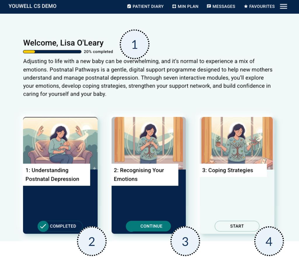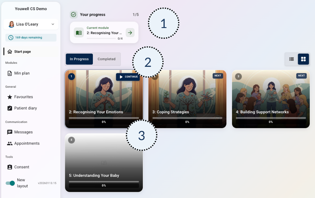 - Pasienten ser en velkomstmelding og en progresjons-widget som viser neste modul de skal jobbe med.