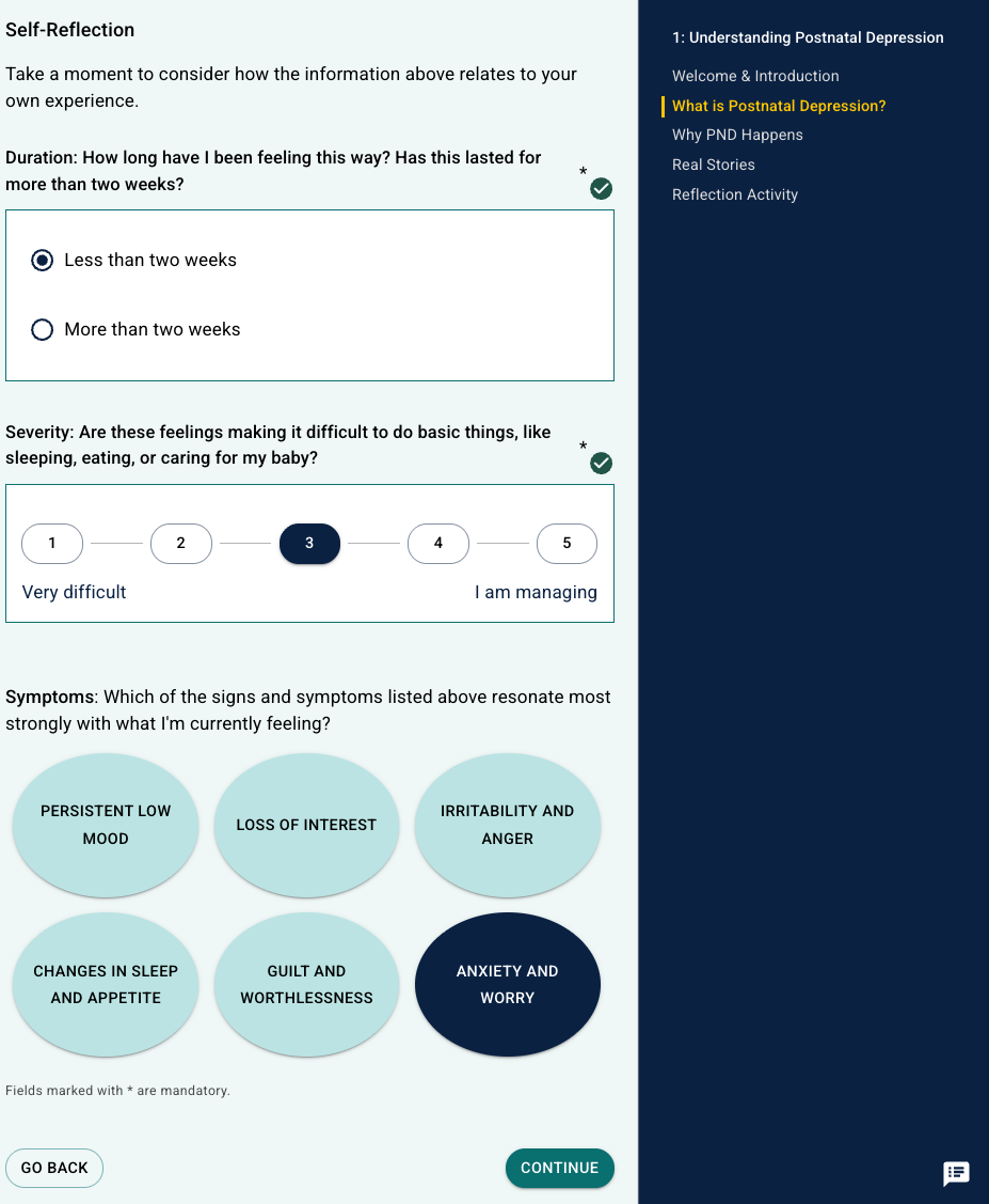 - Pasienten ser en velkomstmelding og en progresjonsskala som viser hvor langt gjennom programmet pasienten er kommet.
