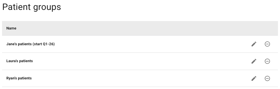Det er mulig for administratorer og superbrukere på kontoen å sette opp og redigere ulike grupper. Behandleren har dermiot ikke tilgang til å legge til nye grupper, men kan se hvilke av sine pasienter som tilhører ulike grupper.