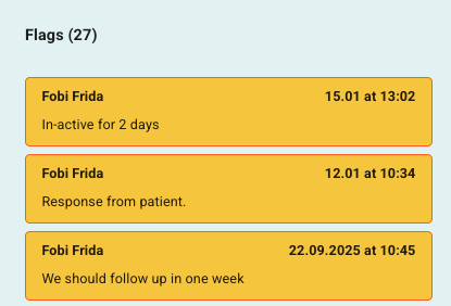 Denne flisen viser flagg som er registrert blant pasientene i organisasjonen. Flagg som er registrert som følge av et spørreskjema eller noen helseregistreringer er markert i gult, mens flagg som er satt på meldinger, moduler eller lagt inn manuelt vises i rødt.