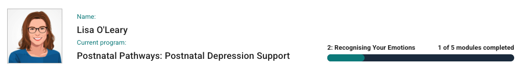 Uansett på hvilken underside man befinner seg: øverst vises navn, nåværende program, bilde, og modul pasienten arbeider med.