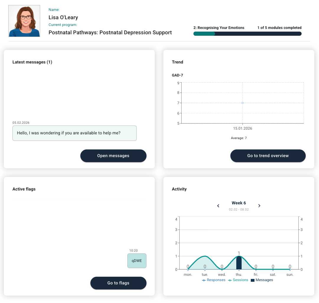 Det er mulig at ikke alle fire fliser er synlige som i eksempelet over; flisene som presenteres avhenger av aktivitet fra pasienten og utestående saker relatert til oppfølging. Status-siden viser flisene som er relevante for den spesifikke pasienten (med mindre administratoren på kontoen har angitt at fliser alltid vises).