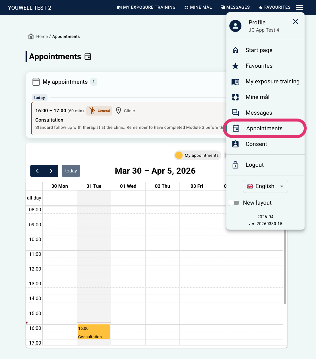 Visning fra forside i pasientapplikasjonen, tidigere design (før 2026).