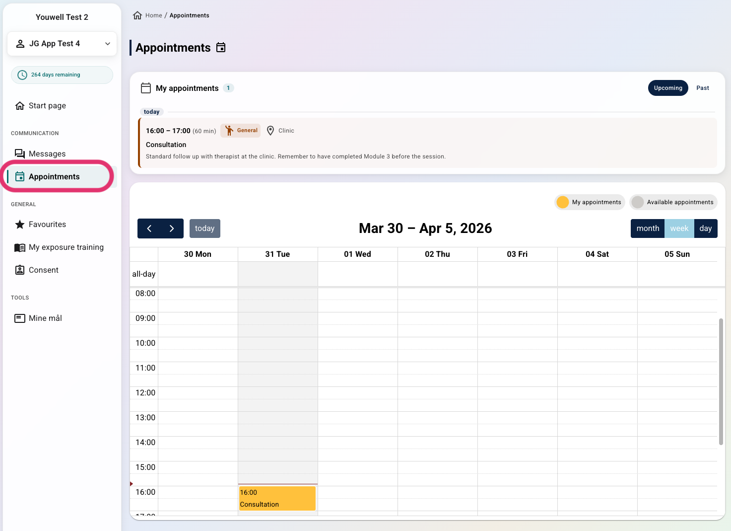 Når pasienten har kommet i gang med programmet, kan det være behov for tettere oppfølging med behandleren, spesielt hvis pasienten har utfordringer eller har flagget at det er ønskelig med ekstra hjelp. Pasienten det gjelder kan identifiseres i oversikten, og menyvalget Avtaler brukes for å vise avtaler og tilhørende informasjon.
