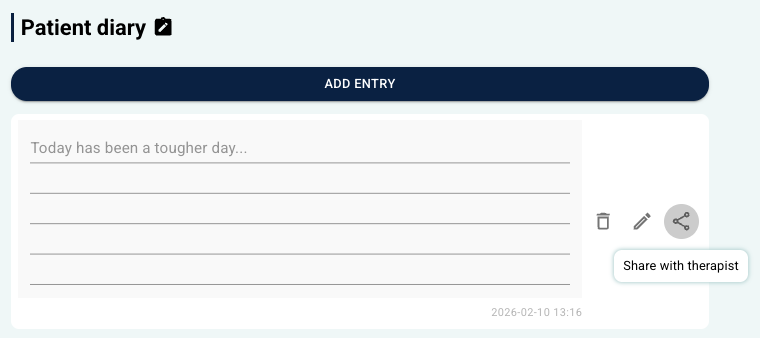 Pasienten kan bruke dagbok-funksjonen til å skrive notater i løpet av programmet. Notatene er som standard ikke synlige for behandleren, men pasienten kan velge å gjøre dem synlige ved bruk av delingsikonet.