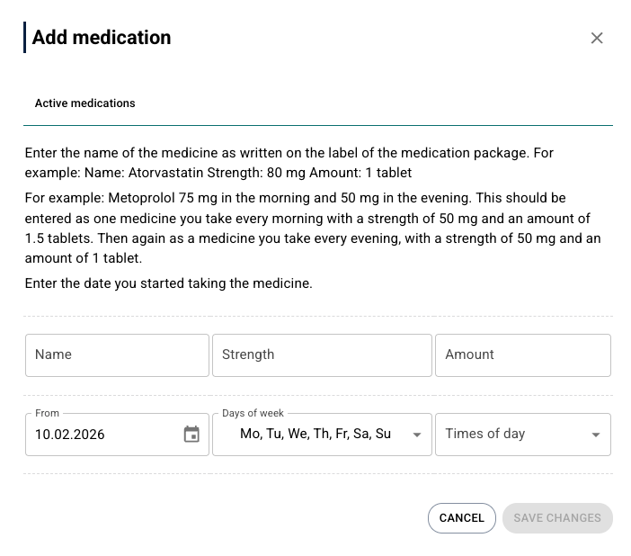 Pasienten kan legge inn medisinene sine under Min helse. Først legges en ny medisin til i skjemaet under Medisinliste, og deretter registreres om medisinen er tatt som planlagt eller ikke. Disse opplysningene vises for behandleren som en sammenleggbar liste med dato og tid for inntak eller uteblivelse. Når en medisin er avsluttet, flyttes den til Seponerte Medisiner-seksjonen.