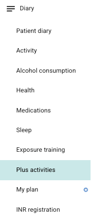 Hvis det inngår en dagbok eller et registreringskomponent i programmet som pasienten skal fylle ut, er det en egen side for dette under Dagbok-seksjonen i menyen. Fanene som finnes her gjenspeiler helseregistreringene som er aktivert på programmet pasienten er tildelt.