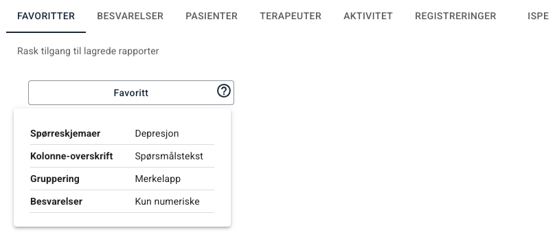 Denne fanen er den første du vil se under Dataeksport, og den inneholder en liste over ulike rapporter som du har lagret/bokmerket fra tidligere. Du vil ha mulighet til å lagre noen favoritter når du oppretter nye uttrekk fra Besvarelser-fanen.