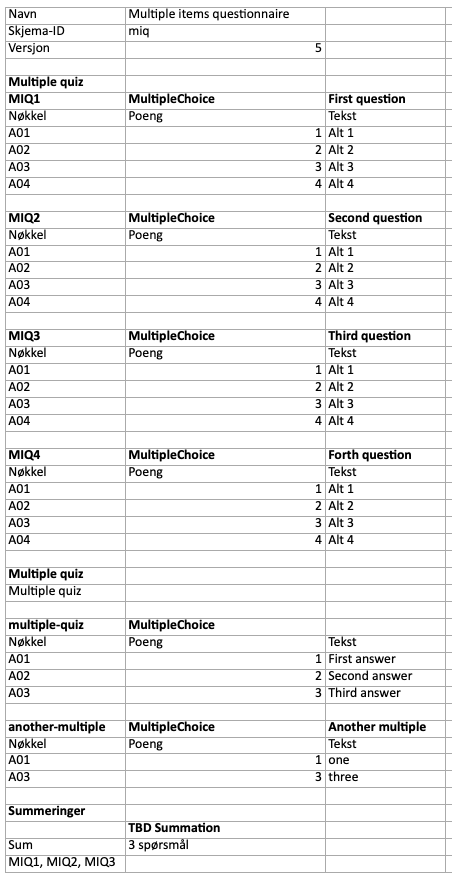 Deretter vil man finne en kodebok per versjon av hvert skjema som er inkludert i uttrekket. Dette vil vise en oppsumering likt det man finner under Skjema-utskrift på programmet. Her ser en liste med spørsmålene som er inkludert i uttrekket, datatype det gjelder, tilsvarende spørsmålsnøkkel og skårverdi, og summeringer.