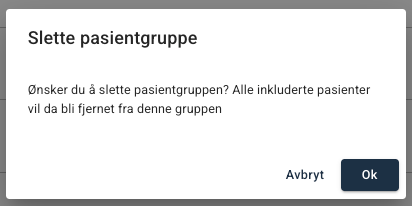 For å slette en pasientgruppe klikker du minustegnet, så vil du se et popupvindu som det her: