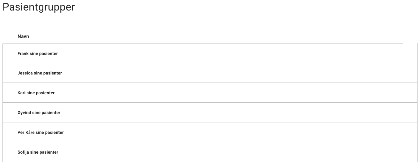 Når du klikker inn på Pasientgrupper, ser du en liste over de eksisterende gruppene, men du med administrator-tilgang kan også opprette en ny gruppe. Pasientgruppe tildeles pasienten når de blir opprettet i plattformen. Les mer om hvordan opprette pasienter her: Opprett ny pasient.