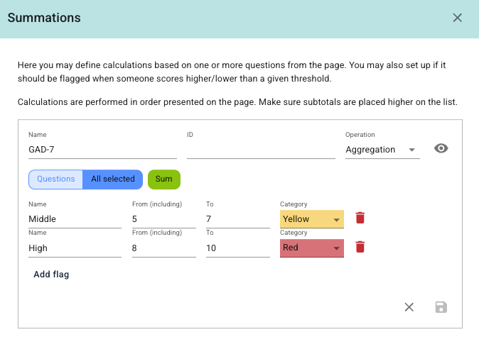 I eksempelet under vises alle spørsmålene på siden, og en sumskår beregnes. Deltakere med et skår mellom 5 og 7 får et gult flagg, og de med skår mellom 8 og 10 får et rødt flagg: