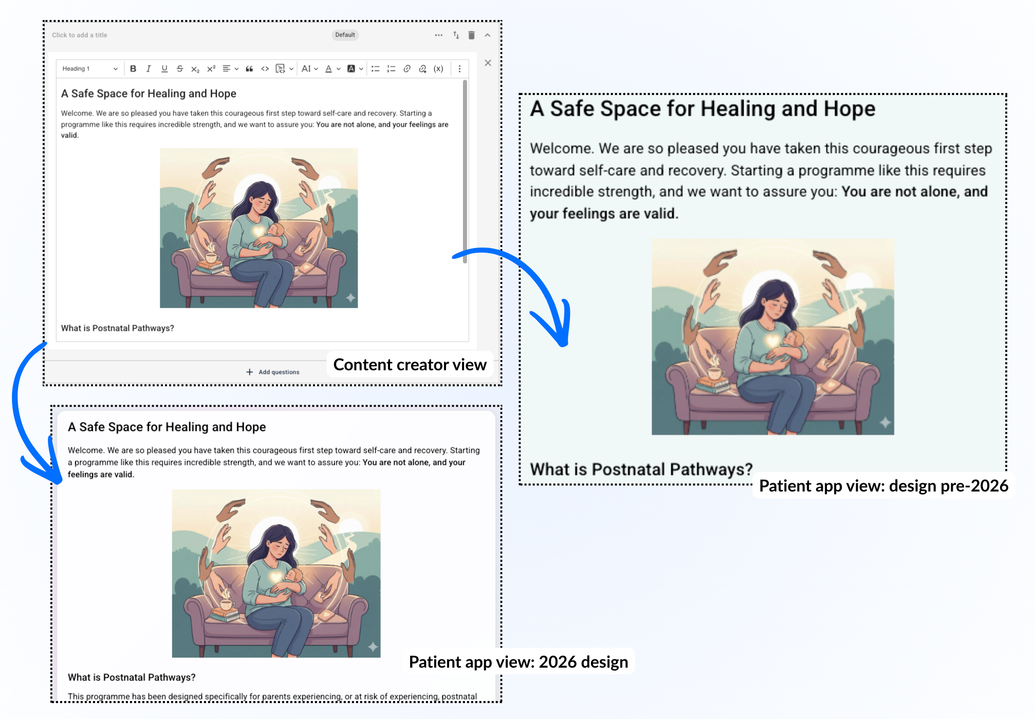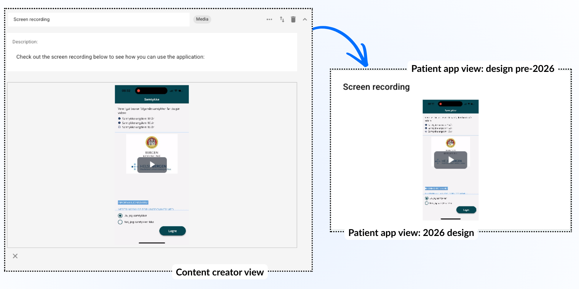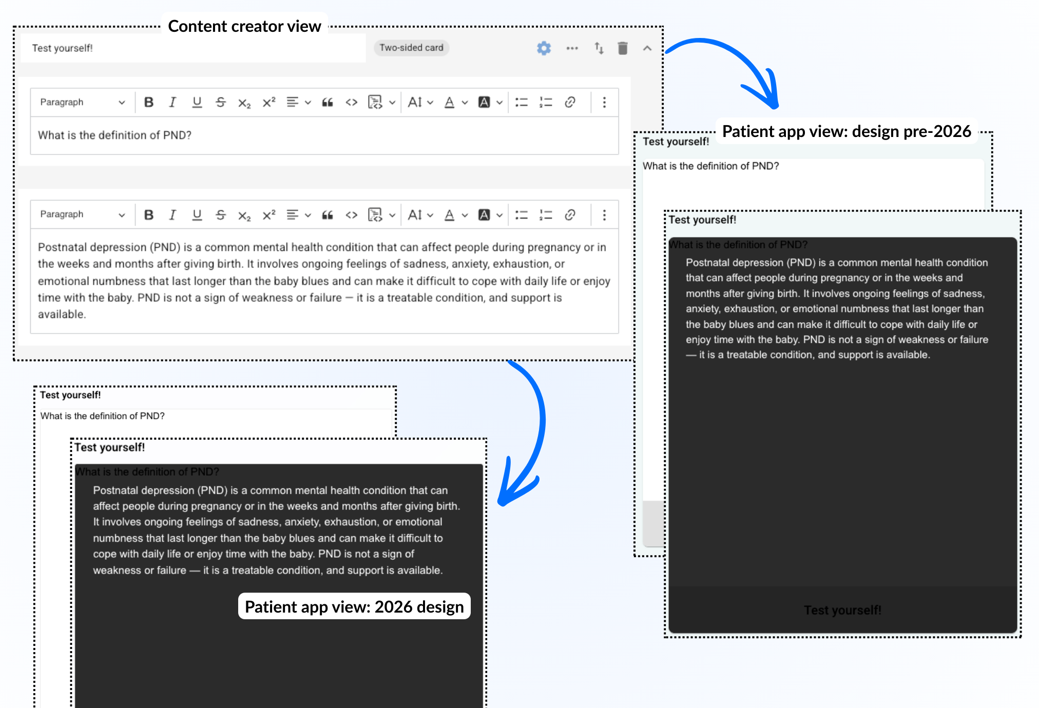 Dette gir mulighet til å lage innhold på to ulike “sider” av samme blokk slik at den andre delen (det nederste tekstfeltet) blir synlig når pasienten viser kortet.