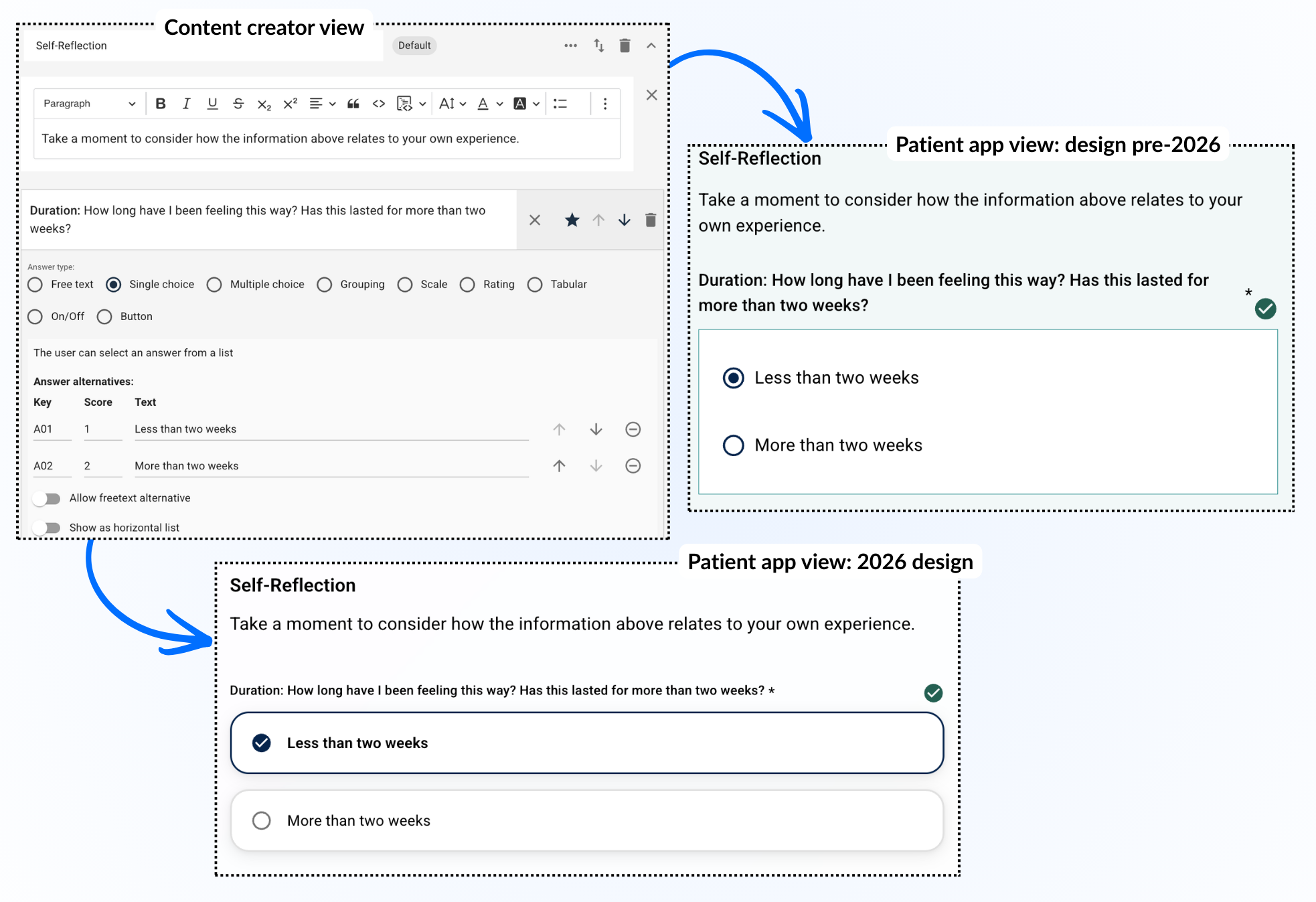 Bruk av enkeltvalg gir mulighet for å angi svaralternativer som pasienten kan velge mellom. Det er også mulig å vise valgene i et bestemt format, for eksempel som en horisontal liste.