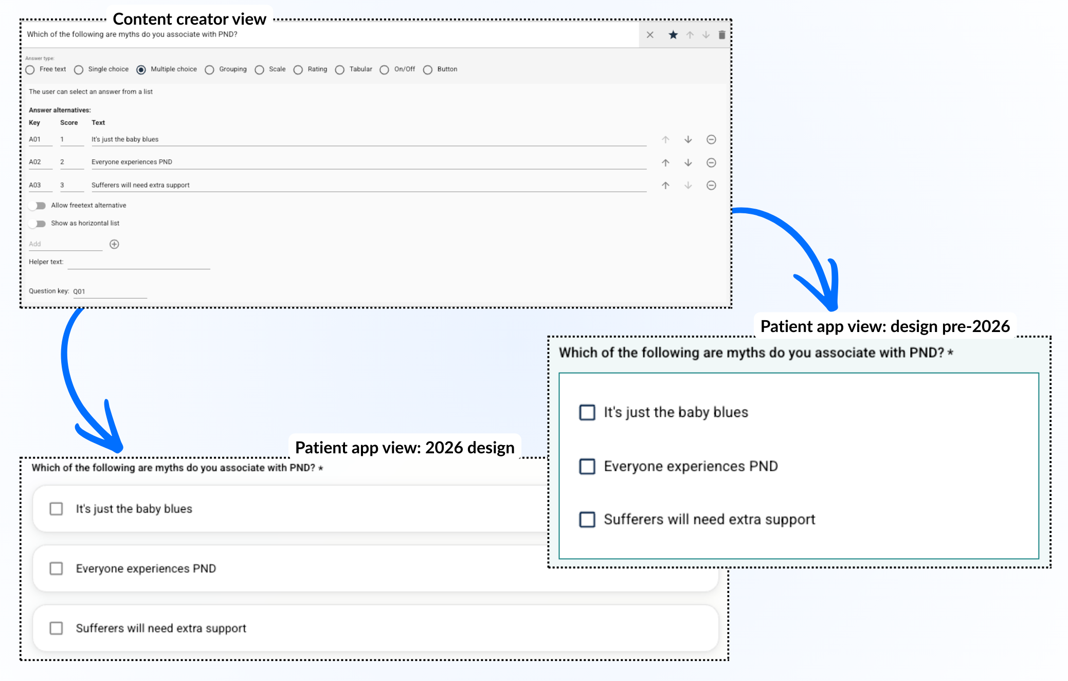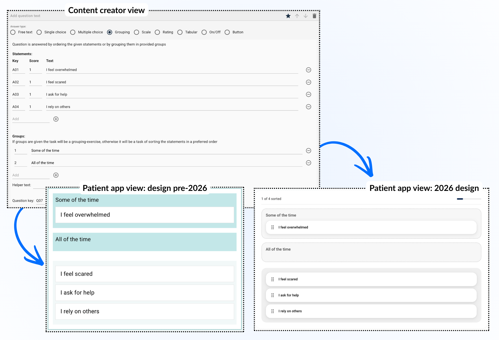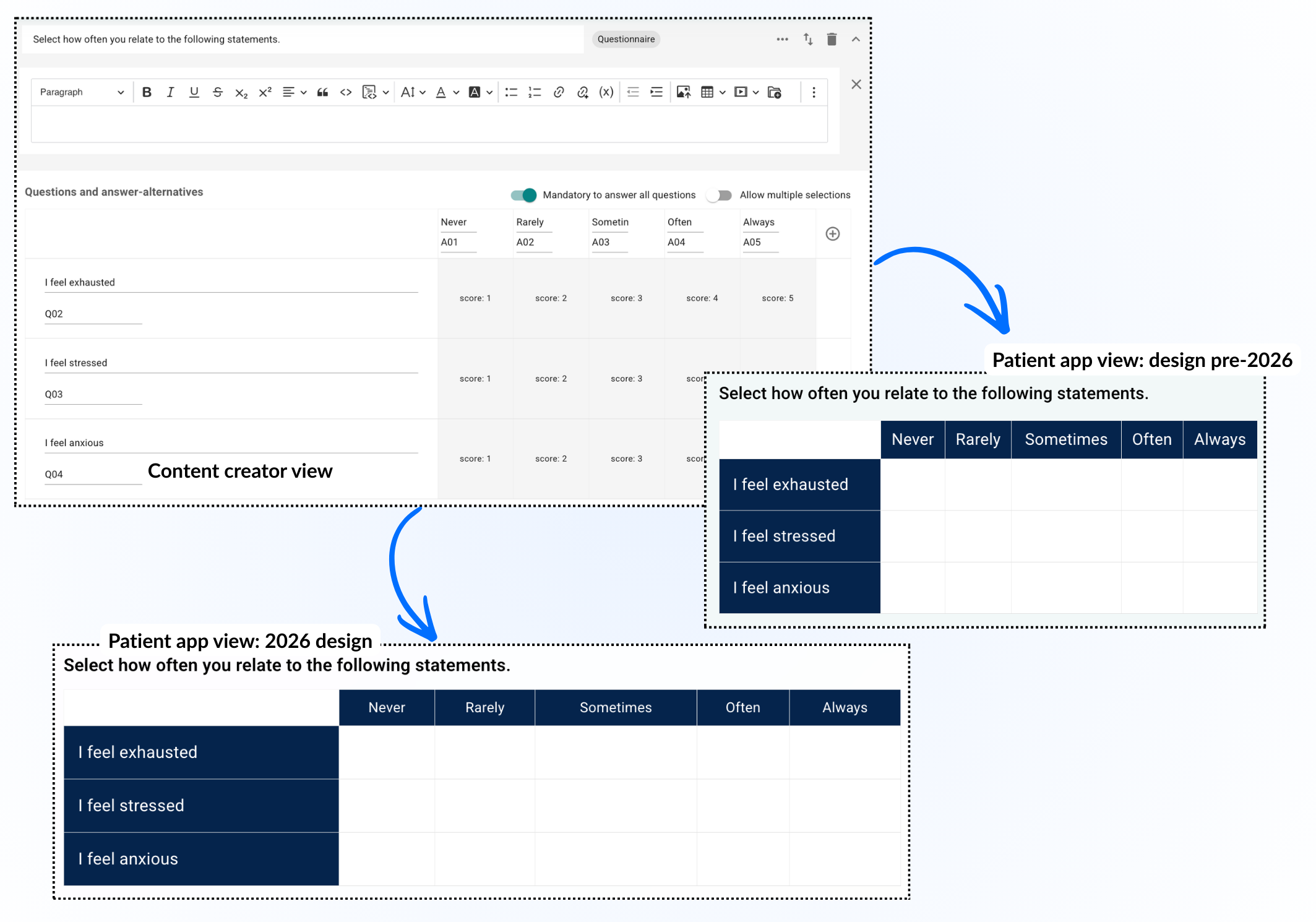 Med et spørreskjema kan man sette opp en tabell som pasienten kan bruke for å gi en skår til ulike spørsmål eller påstander. Ulike verdier pasienten kan velge mellom kan legges øverst, og en liste med spørsmål eller setninger kan legges til nedover i tabellen. Det er mulig å tilpasse om alle spørsmål er obligatoriske å besvare og om pasienten kan velge flere svar på samme spørsmål.