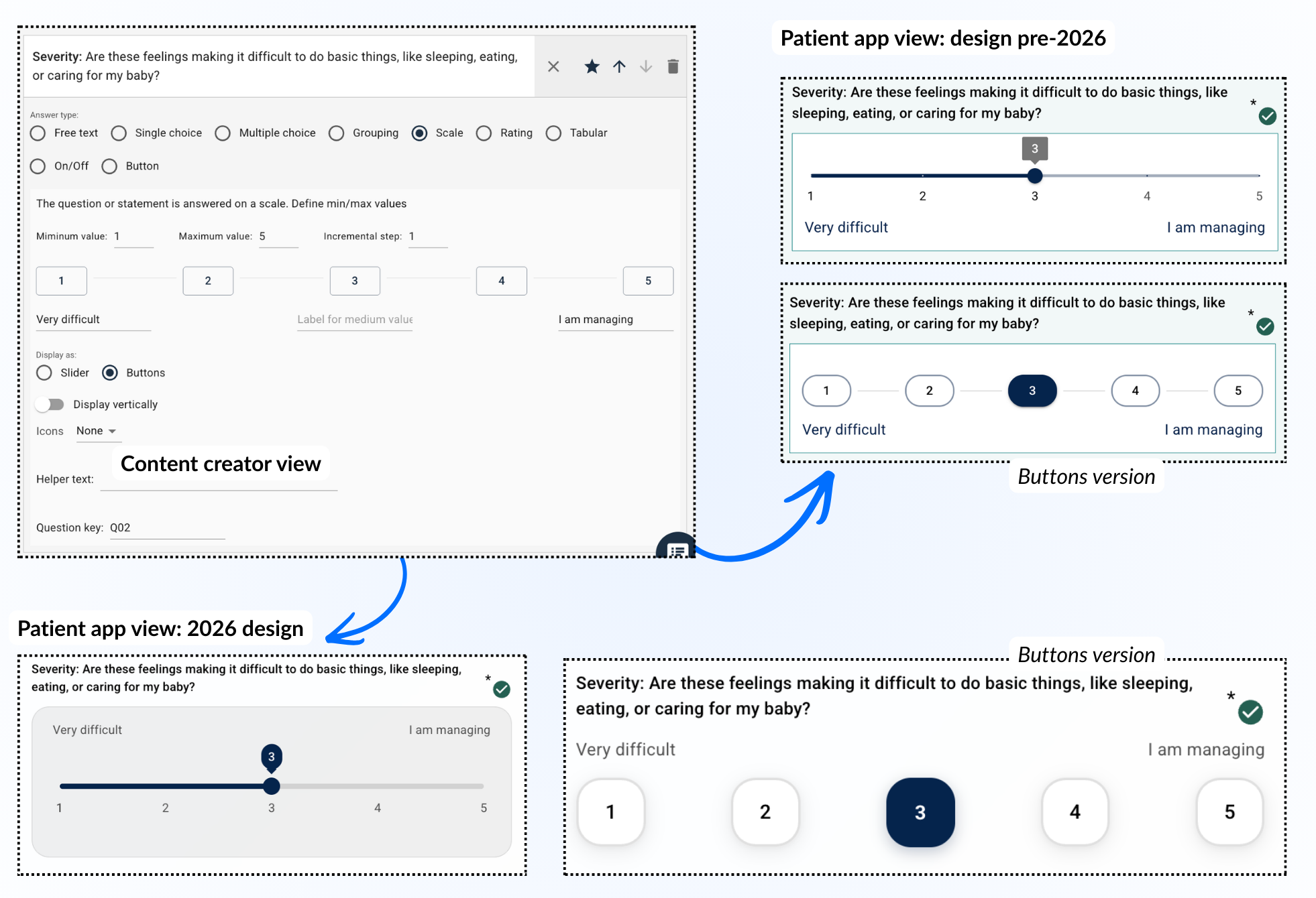 Ved å velge en skala for svartype kan pasienten svare på et spørsmål eller en påstand ved å velge en verdi mellom en minimums- og maksimumsverdi. Dette kan vises ved hjelp av en glidebryter eller knapper.