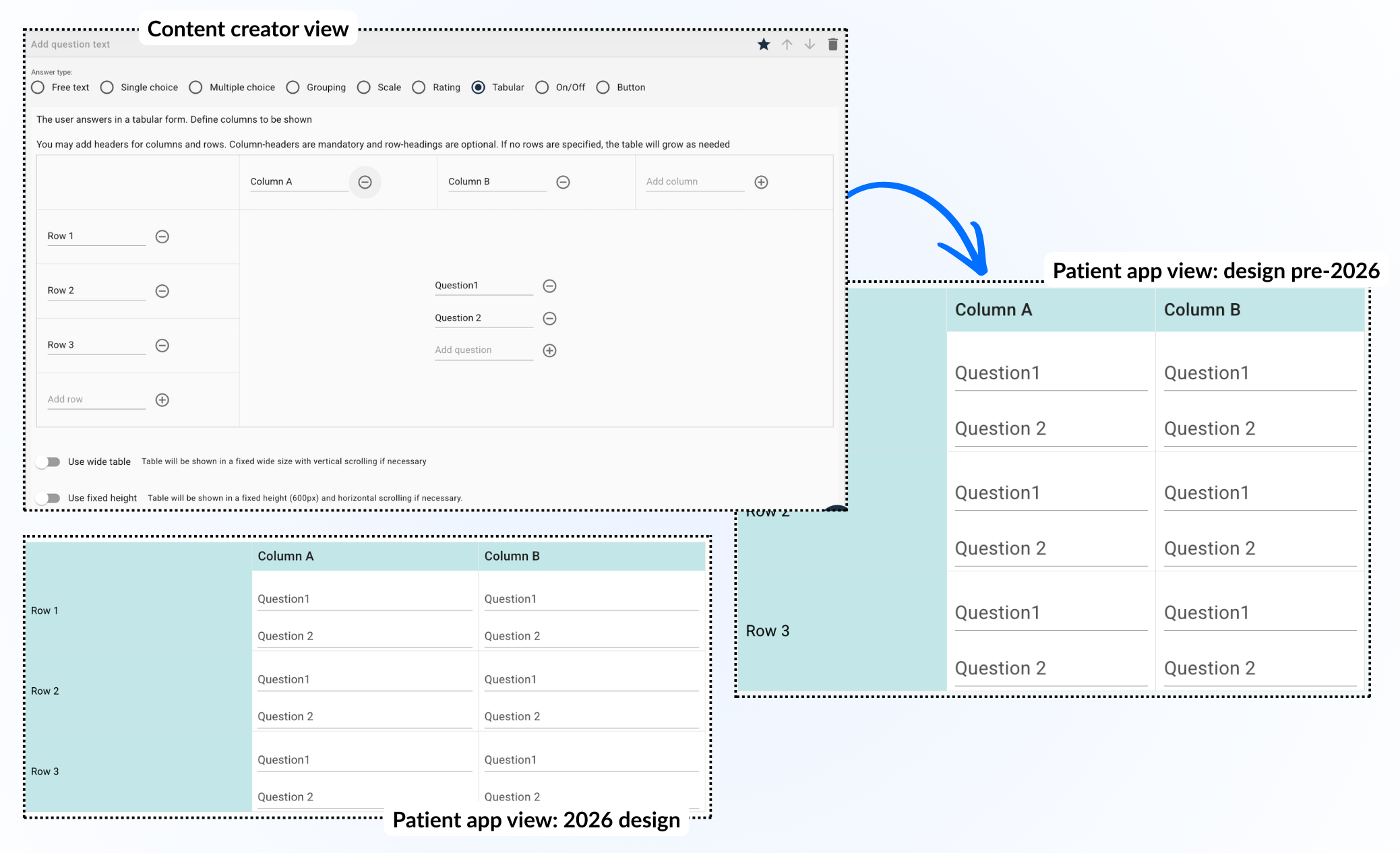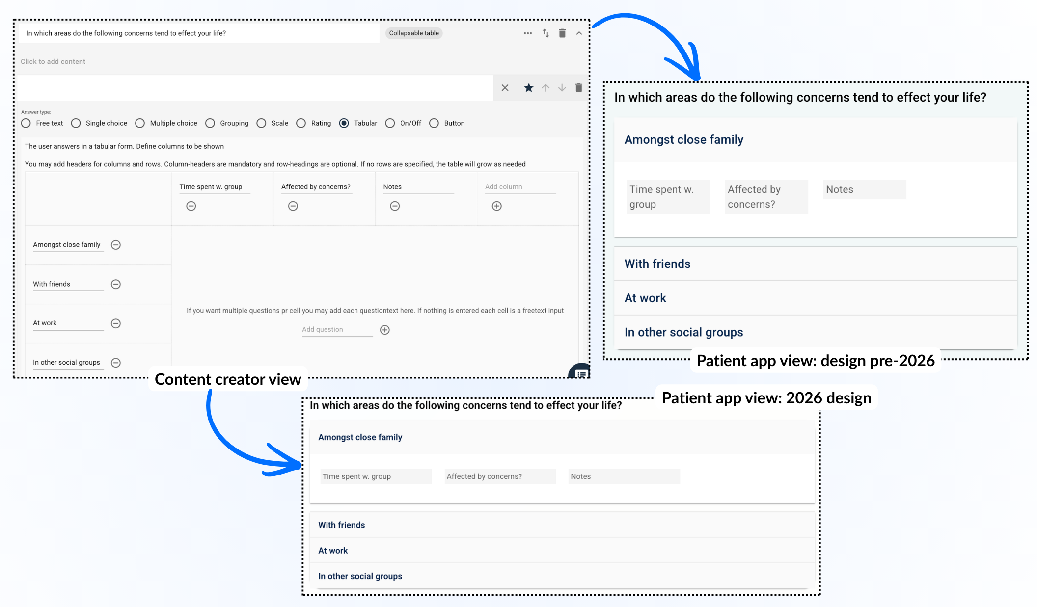 Dersom man ønsker å stille mange spørsmål samtidig og samtidig unngå en stor liste, kan en sammenleggbar tabell brukes. Det gir pasienten mulighet til å åpne hver rad for å svare på spørsmålene i stedet for å vise hele listen direkte.