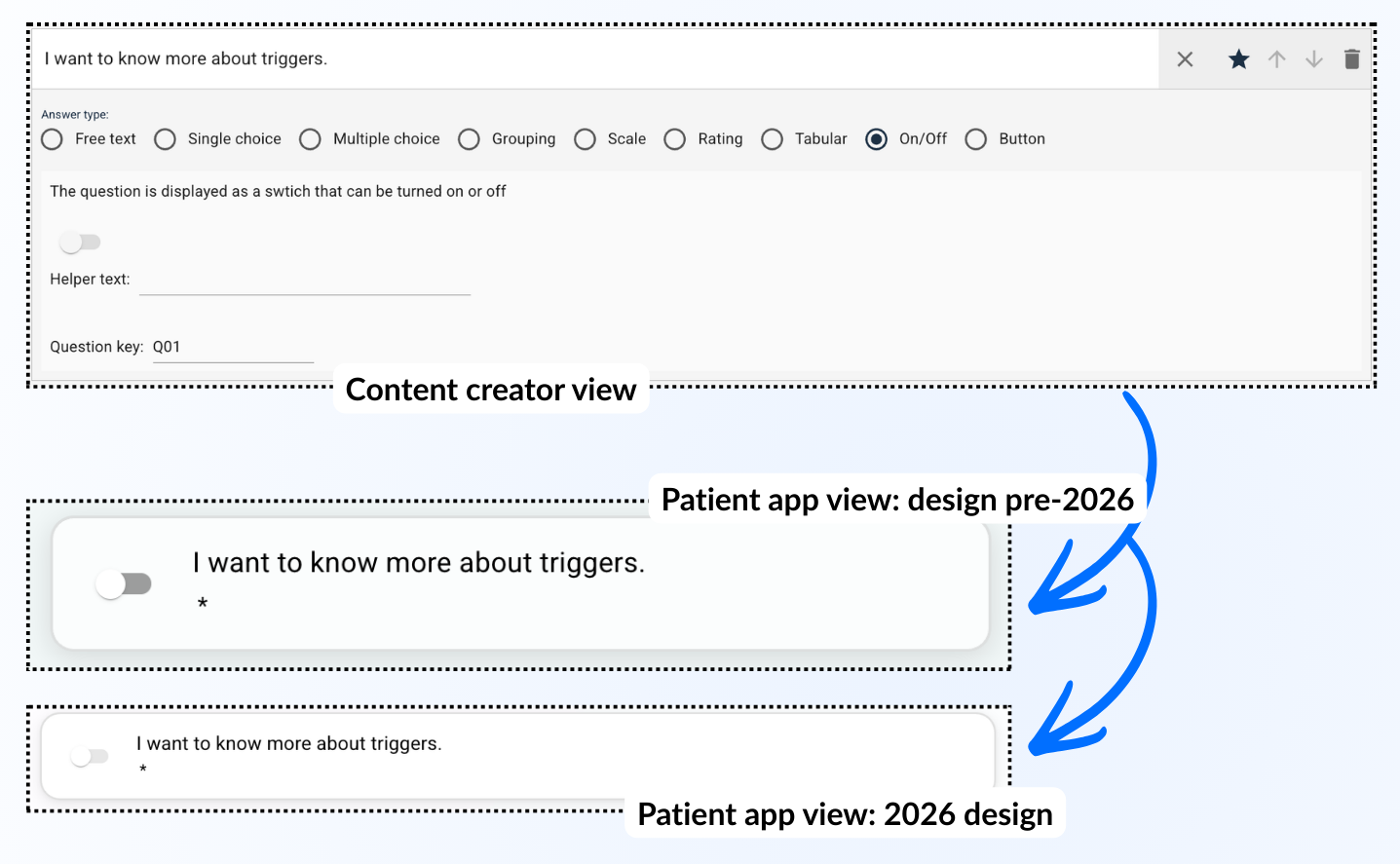 Av/På-spørsmål gir en enkel måte for pasienten å indikere om en påstand er gjeldende eller ikke, for eksempel ved å veksle en bryter.