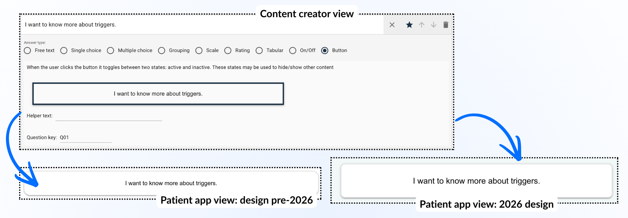 Knapp-spørsmål gir en måte for pasienten å aktivere eller deaktivere et svar ved hjelp av en knapp, som ofte brukes sammen med betingede visningsvalg for å bestemme hvilke elementer som vises videre.