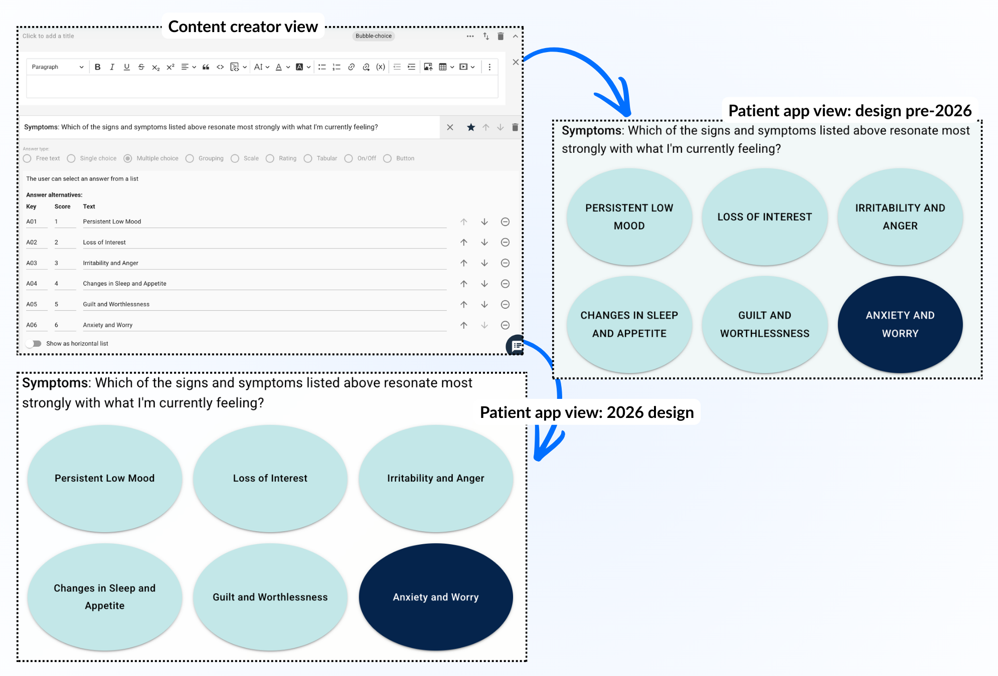 Dette er en måte å presentere et flervalgsspørsmål på, hvor pasienten kan markere flere mulige svar ved å bruke bobler vist for eksempel i en horisontal liste.
