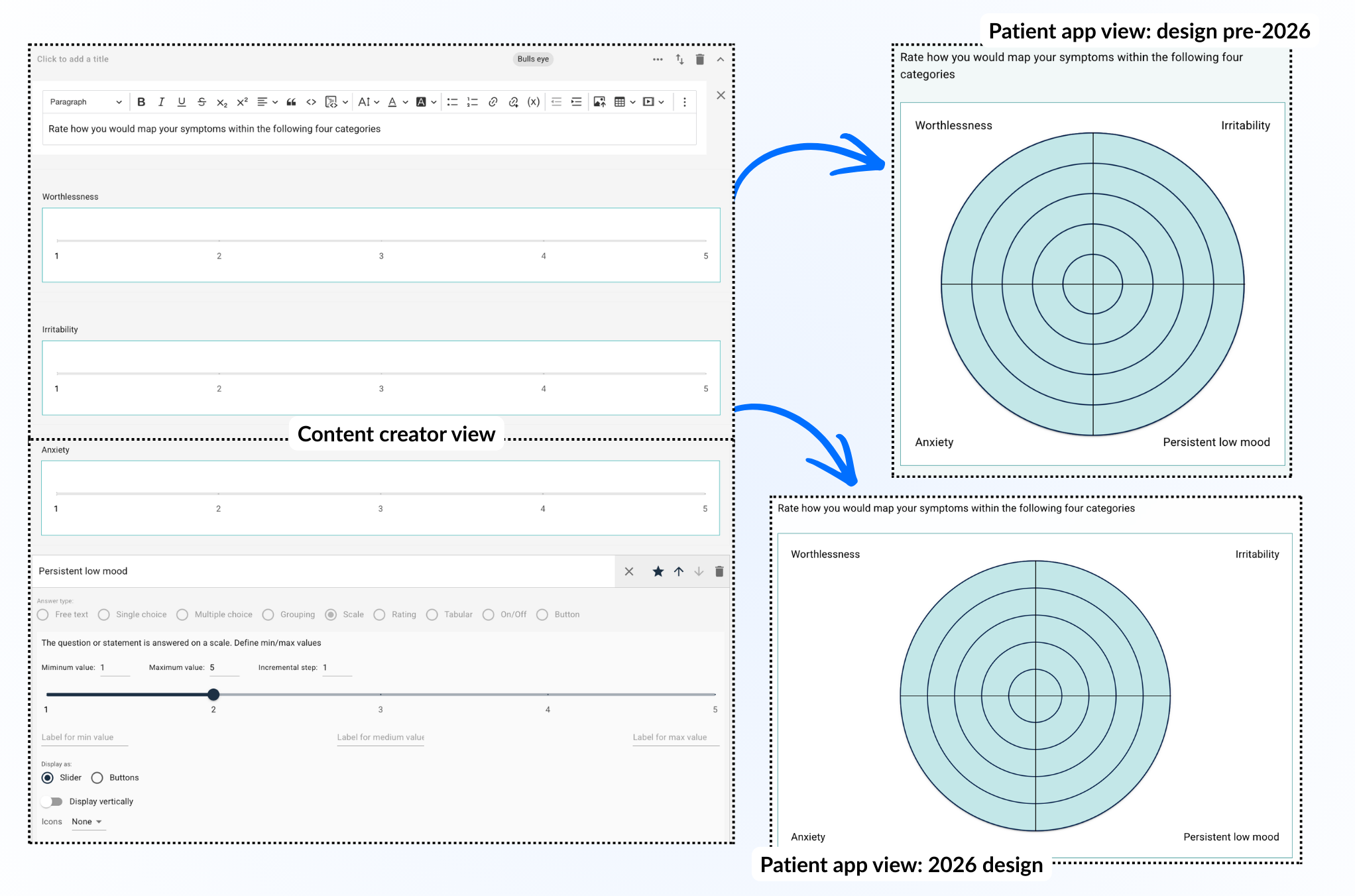 Et blink-spørsmåls-element gir mulighet til å kartlegge pasientens følelser eller respons innenfor en sirkel delt opp i segmenter. Dette gir en visuell fremstilling av en skala der pasienten kan velge en verdi innenfor et bestemt intervall for flere kategorier.