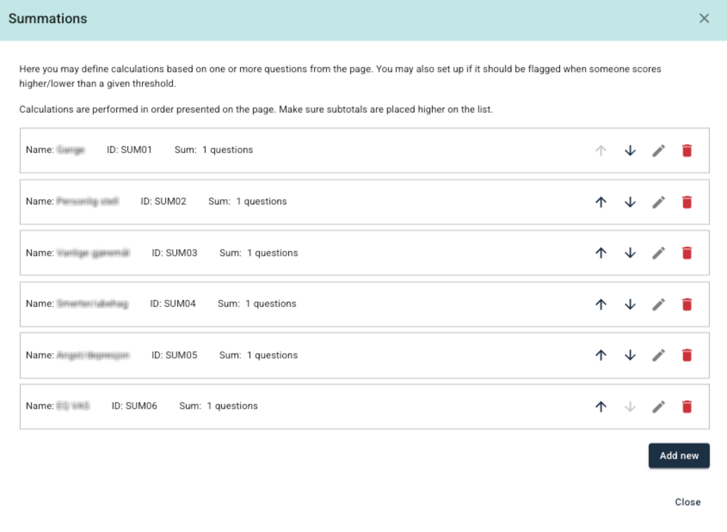 Summeringene gjennomføres i den rekkefølgen de er listet i oversikten, og det er mulig å endre rekkefølgen på kalkulasjonene ved hjelp av piler i oversikten. Det er også mulig å redigere eller slette summeringer ved behov.